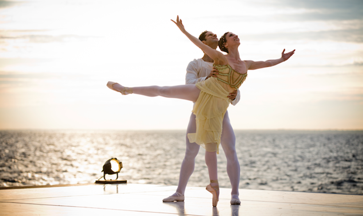 On the stage, a staircase leads to a balcony that leads to nowhere, the show's only set piece, provided for the opening duet from Romeo and Juliet. I'm sure the American Ballet Theater dancers Marcelo Gomes and Luciana Paris would have looked just as lovely indoors, but only lifted against an open sky does one truly understand Juliet as the "winged messenger of heaven" that Shakespeare described.