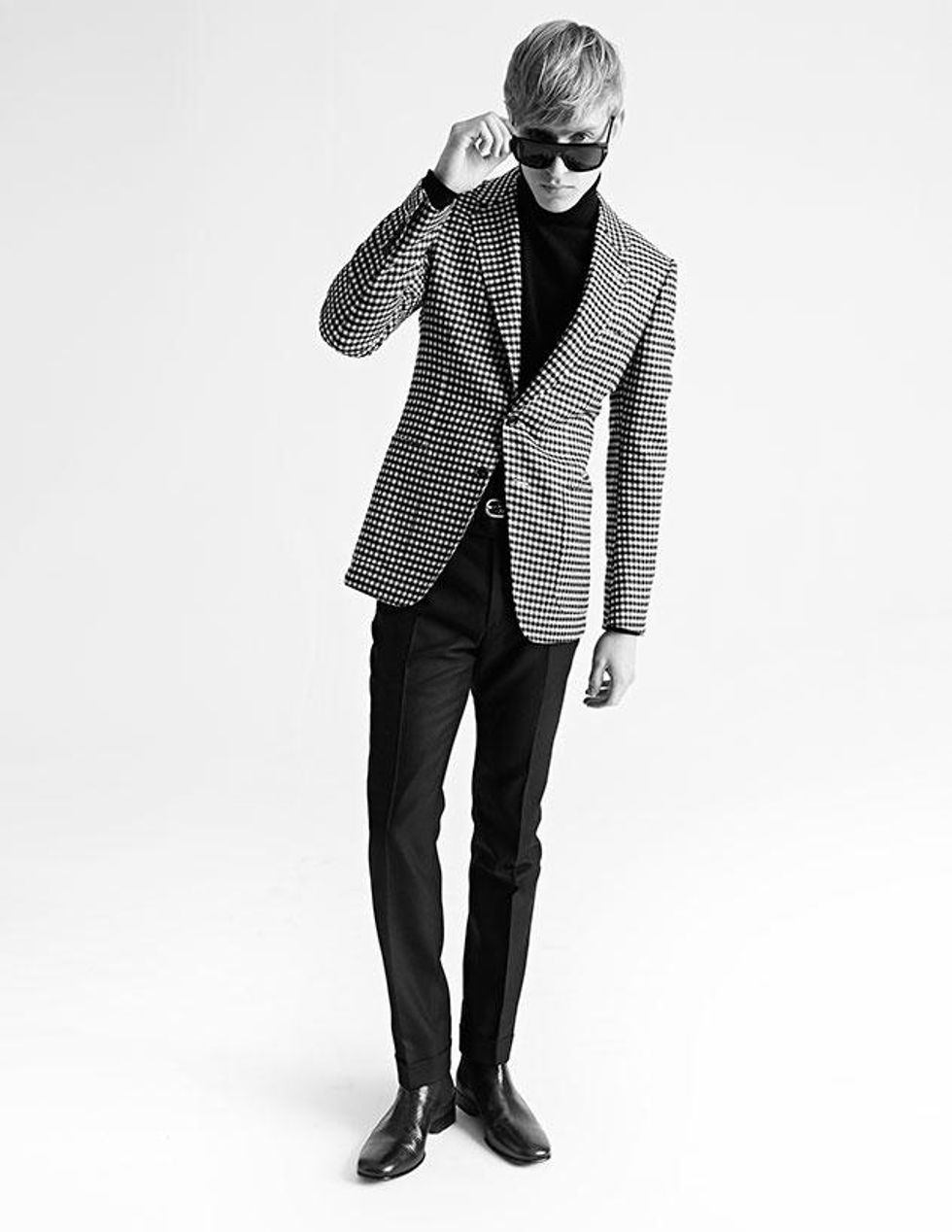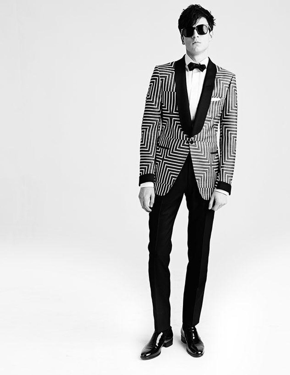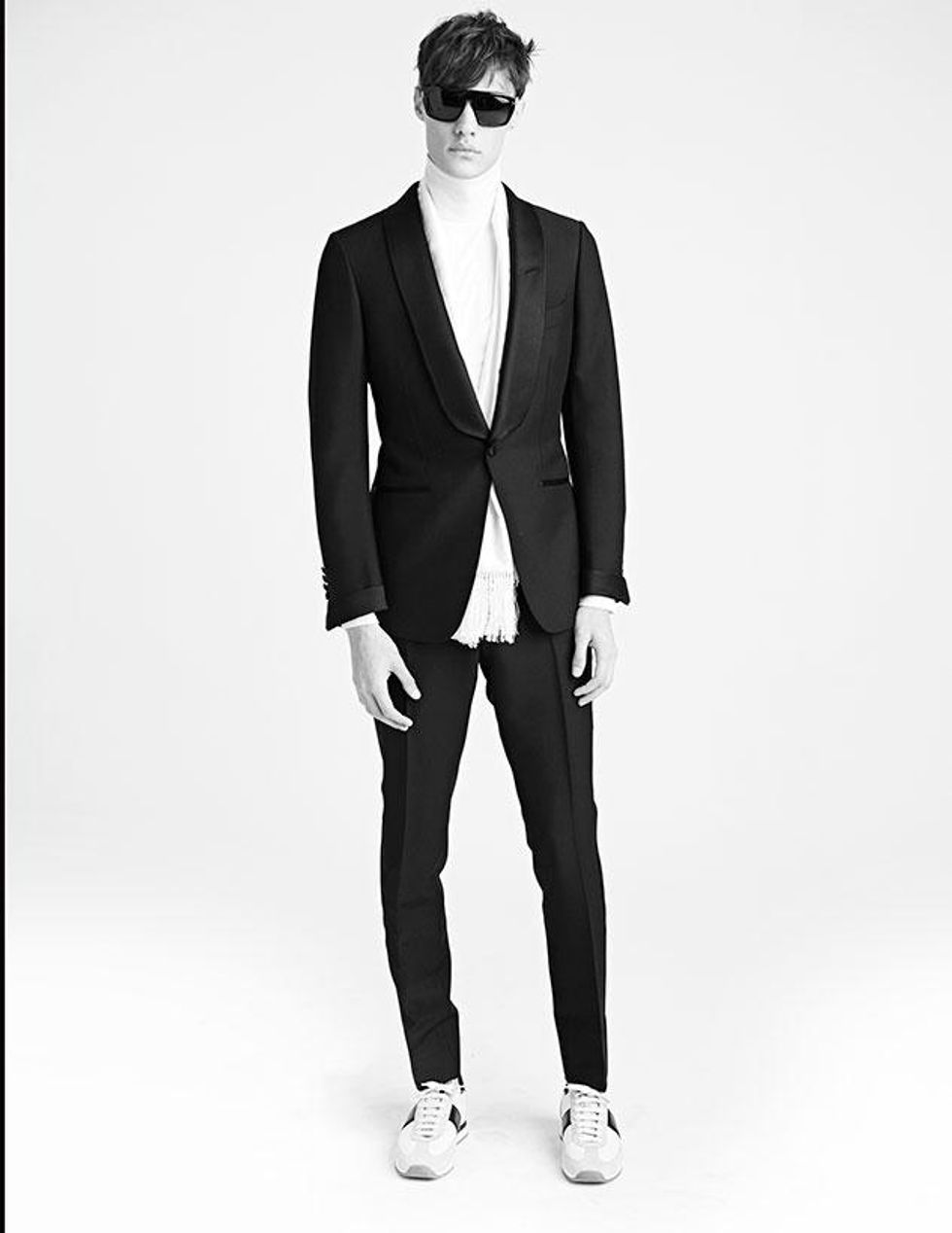 Tom Ford presented his latest menswear collection at London Collections: Men. The focus was on Sixties-inspired silhouettes, with black-and-white patterned jackets, rugged shearling layered over suits, and selvage denim. For eveningwear, the line is clean and modern, with optical prints on silk or velvet jackets, skinny bow ties, and sneakers.