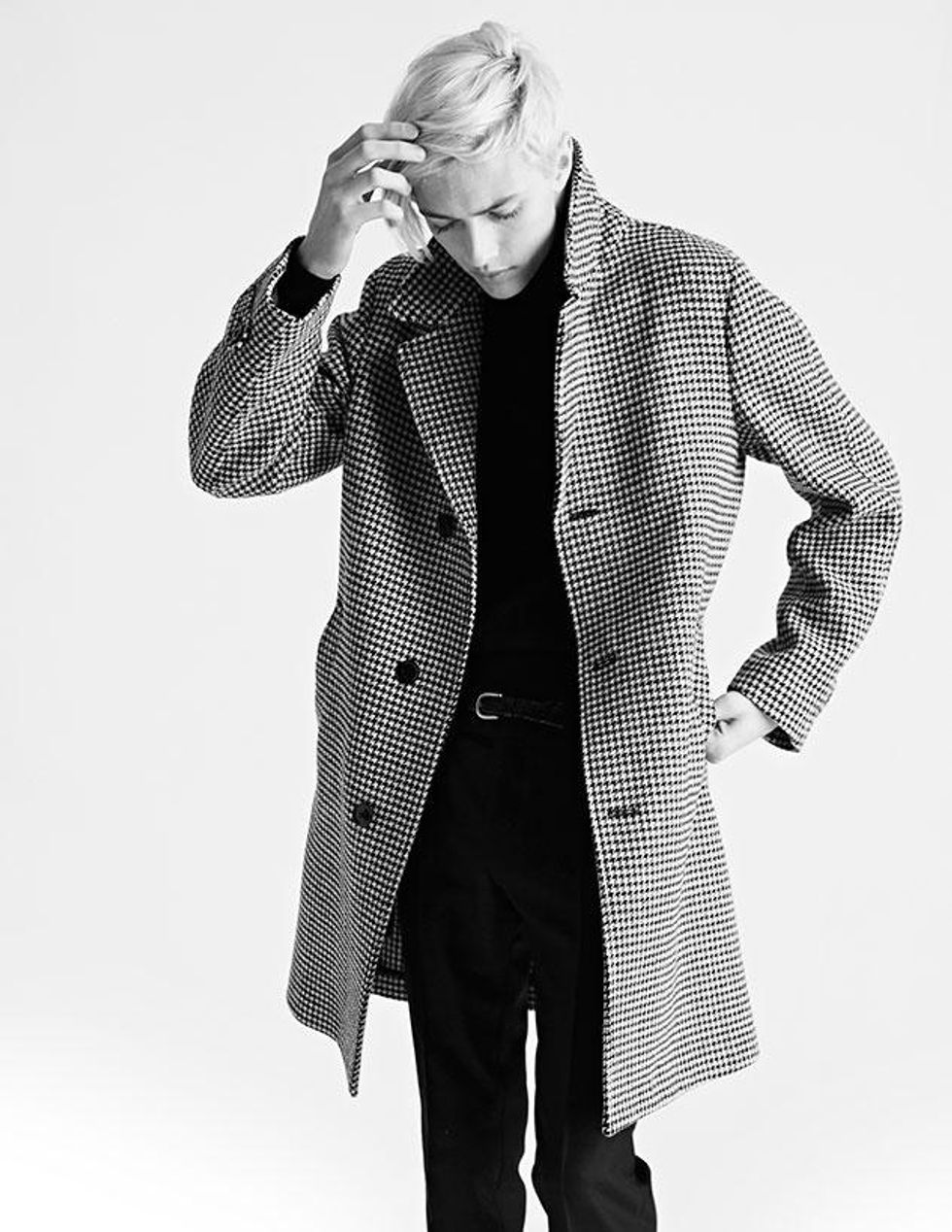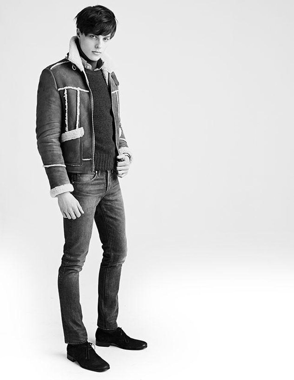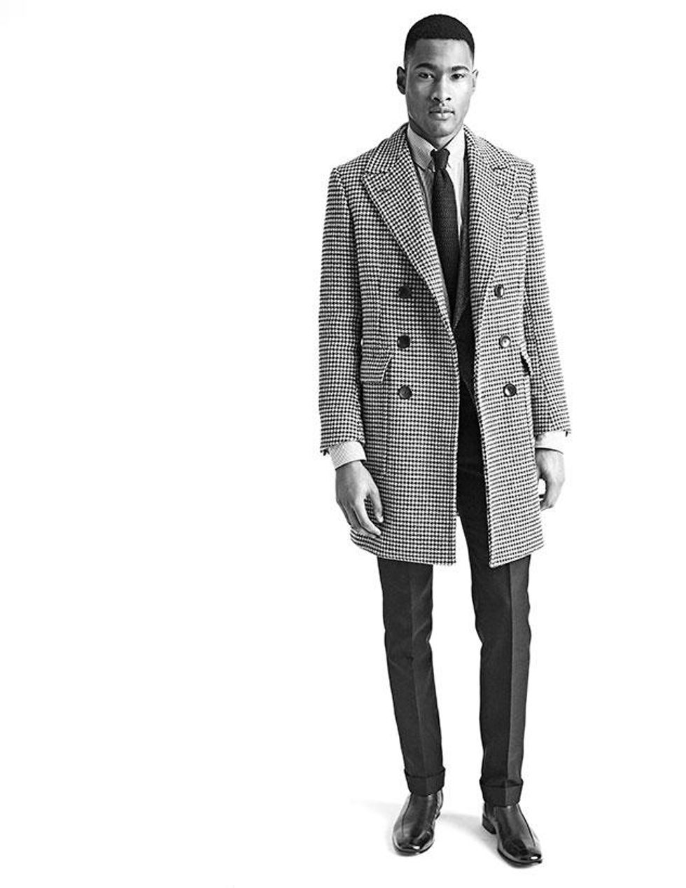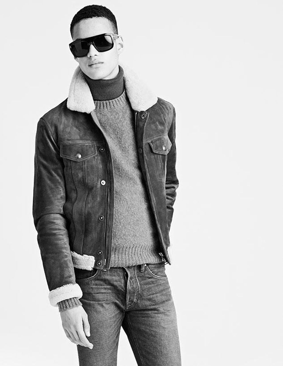 Tom Ford presented his latest menswear collection at London Collections: Men. The focus was on Sixties-inspired silhouettes, with black-and-white patterned jackets, rugged shearling layered over suits, and selvage denim. For eveningwear, the line is clean and modern, with optical prints on silk or velvet jackets, skinny bow ties, and sneakers.