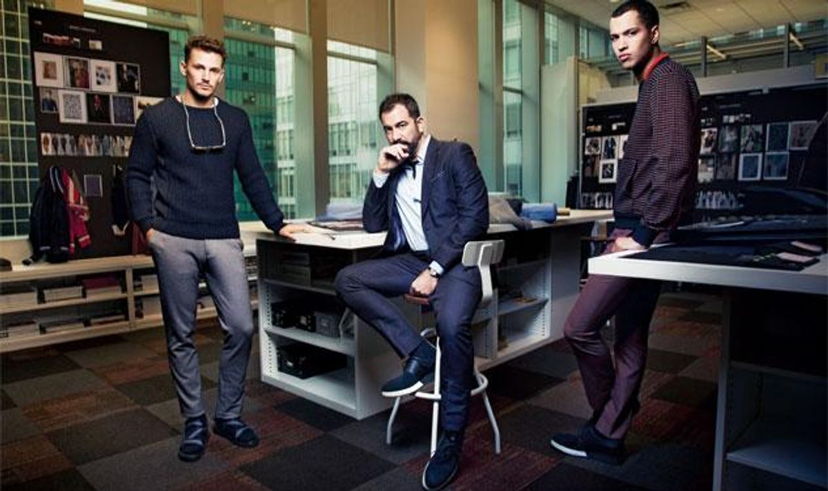 Today, those shoes are being filled by Michael Maccari (pictured, center), a 6-foot-2 designer who wears size-13 leather boots. Maccari's debut 2014 collection as creative director of Perry Ellis marked the brand's return to New York Fashion Week after a two-season hiatus, and immediately rejuvenated a graying menswear line that was drifting farther away from Ellis's casual-cool ideal.
