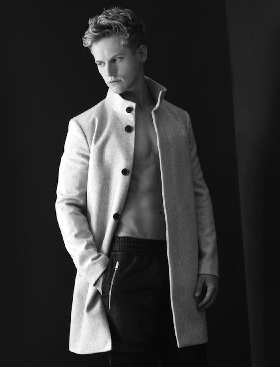 This page, from left to right: Coat by BILLY REID, jeans by J BRAND, shoes by OAK NYC. Jacket by BURBERRY, pants and sneakers by Y-3. Jacket by ALL SAINTS, shirt and denim by GRENSON. Jacket by JOHN VARVATOS, jeans by ALL SAINTS, shoes by VALENTINO. Jacket by MARC JACOBS, jumpsuit by MR TURK, sneakers by jumpsuit RICK OWENS. Coat by THEORY, available at Bloomingdale's