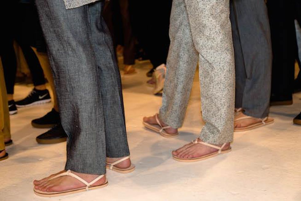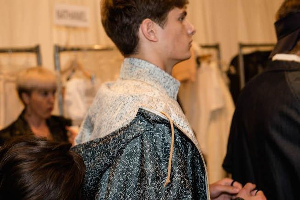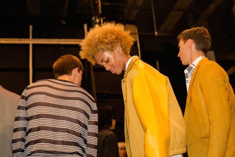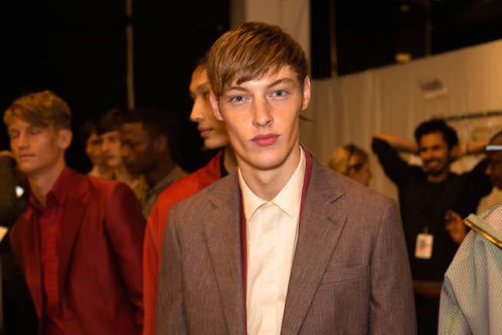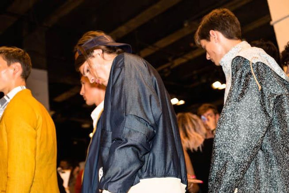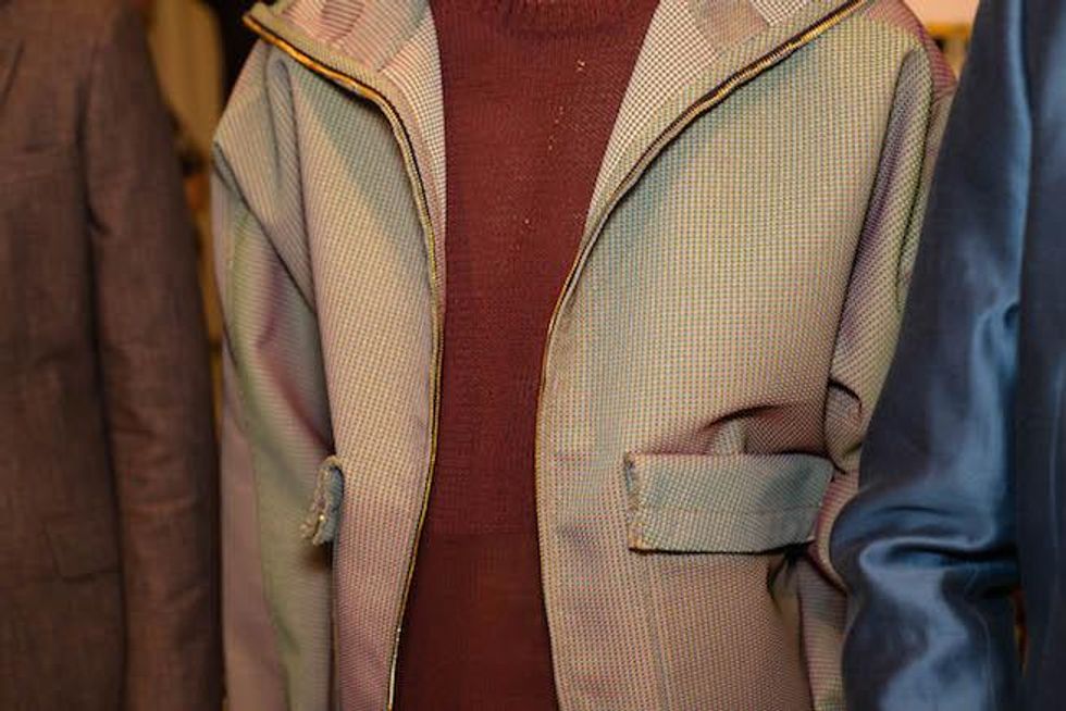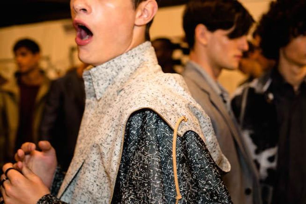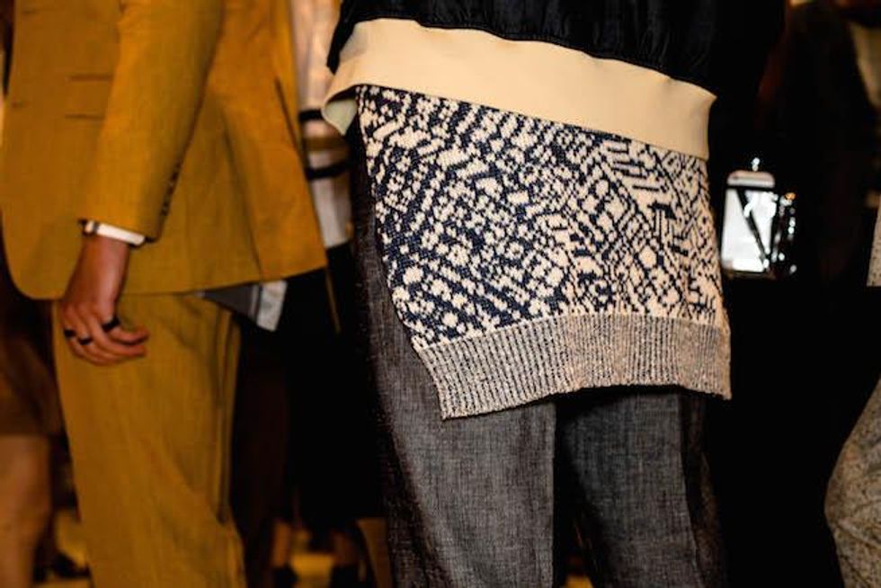 "I was inspired by guys coming to and from the gym," Maccari told WWD, pointing to the open shirts, compression tights under baggy shorts and cropped bombers. Playful prints in sweaters and jackets ranged from explosive weaves to painterly graphics, while the suit silhouette was very structured. The shoulder became more powerful, pants were fuller and the jackets were elongated. "I'm tired of seeing short jackets."