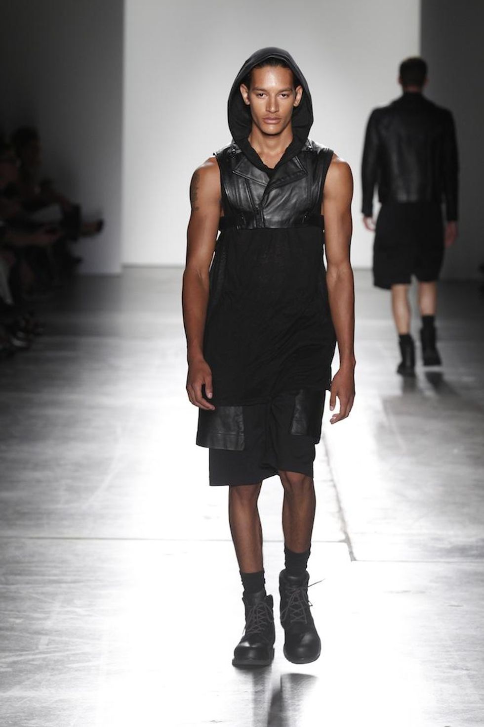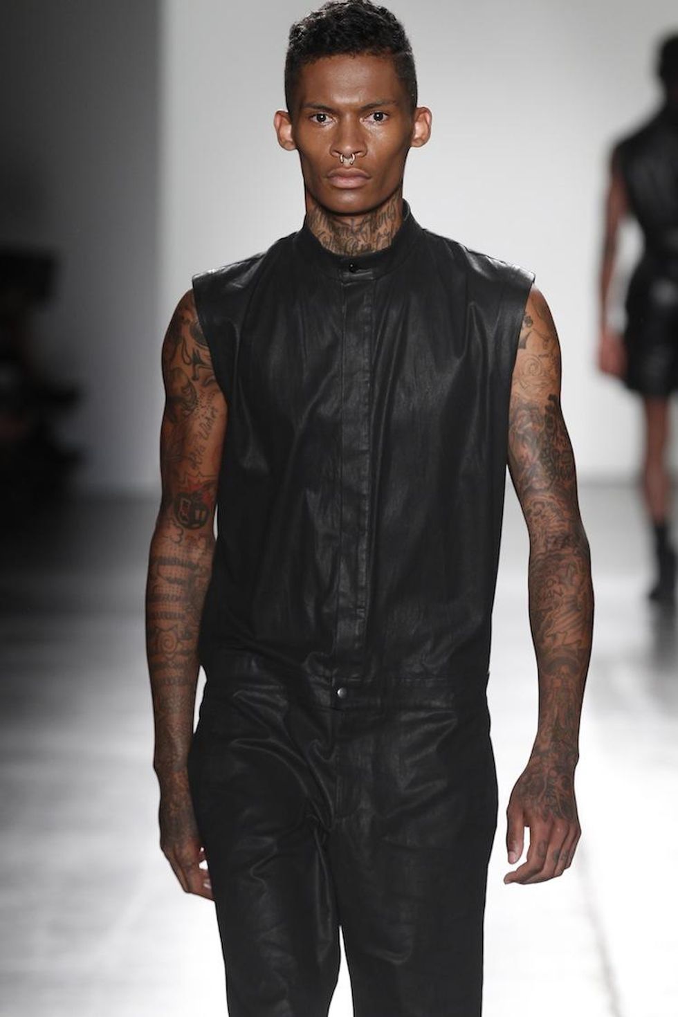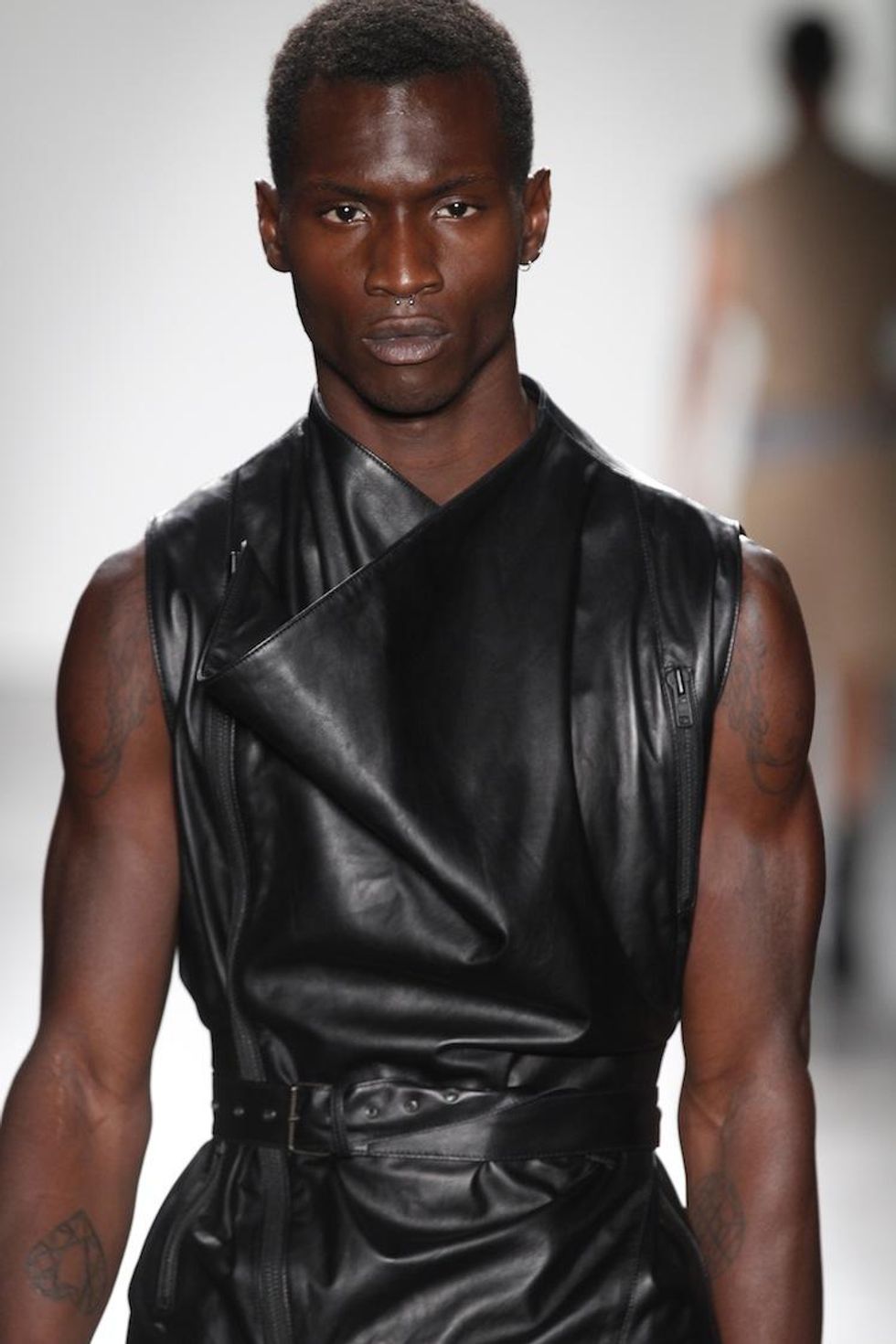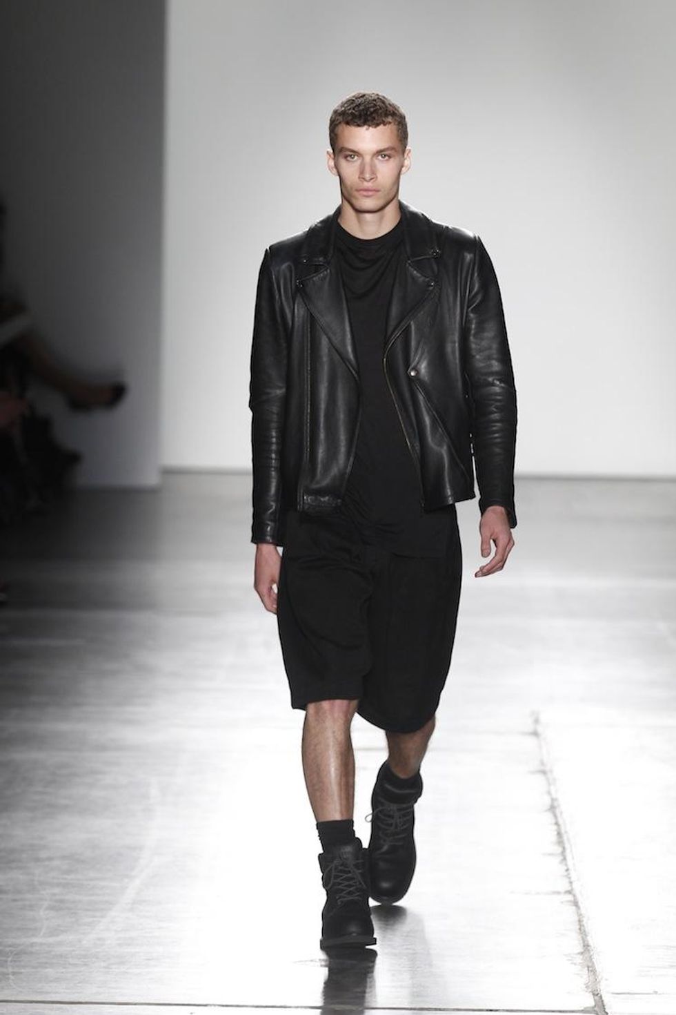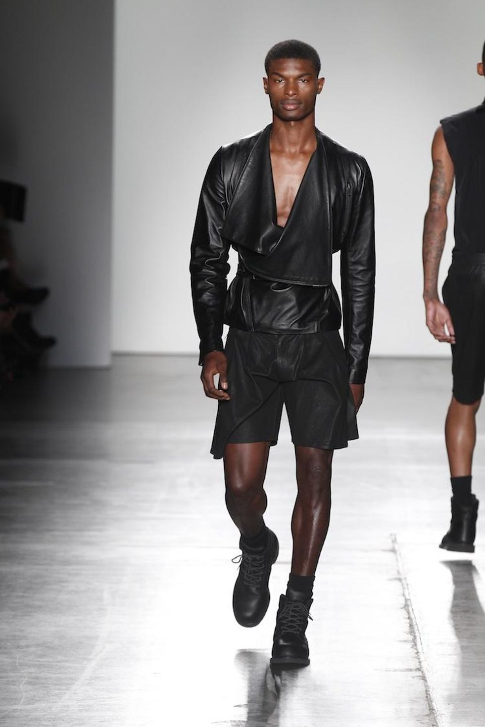 The collection, entitled SYN ("with" in Greek), features extensive work on leather, with biker jackets and androgynous summer separates. We spotted rapper Angel Haze sitting front row. Click through to see the collection, which opened and closed with uber-hot model Adonis Bosso.