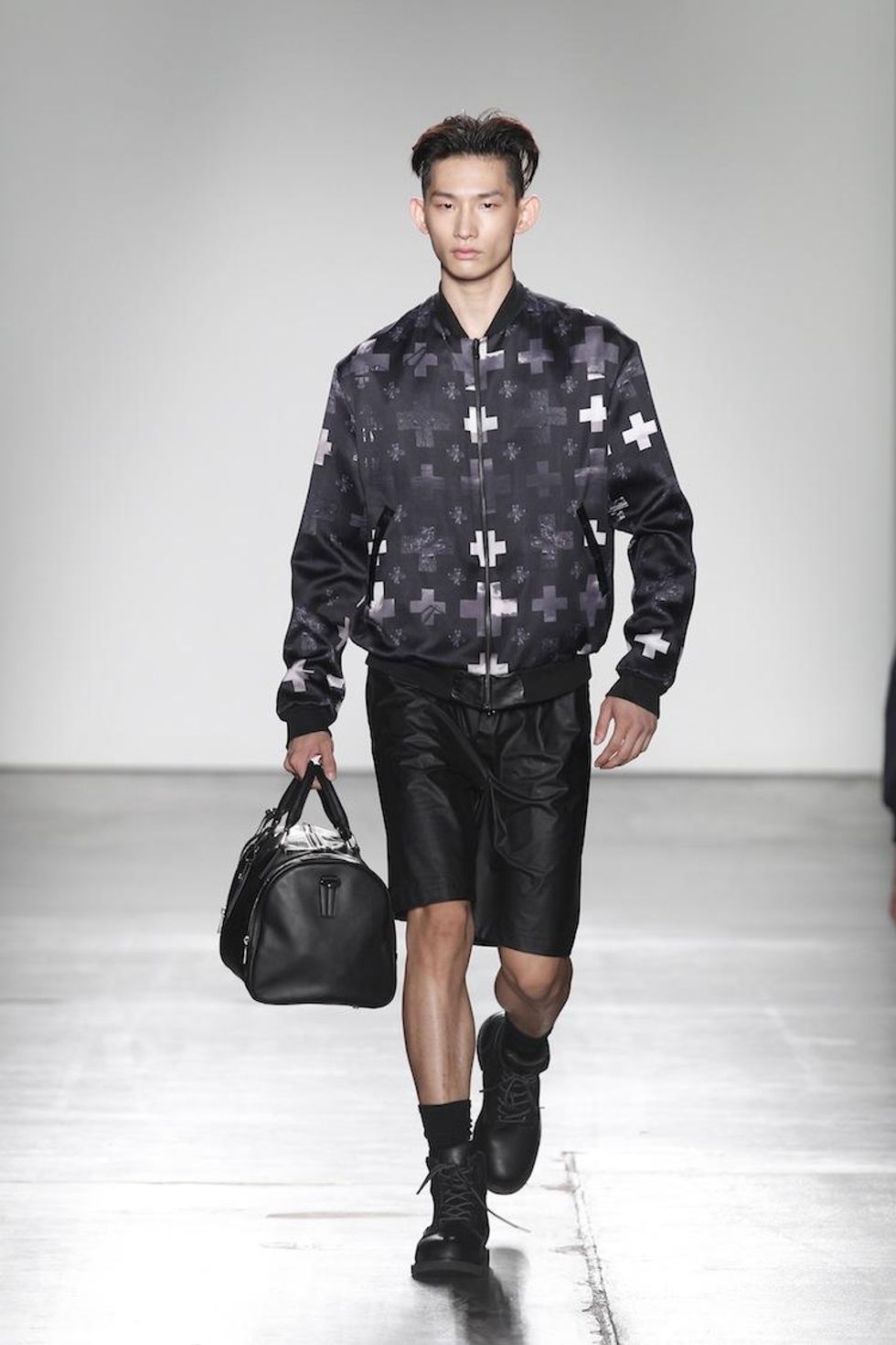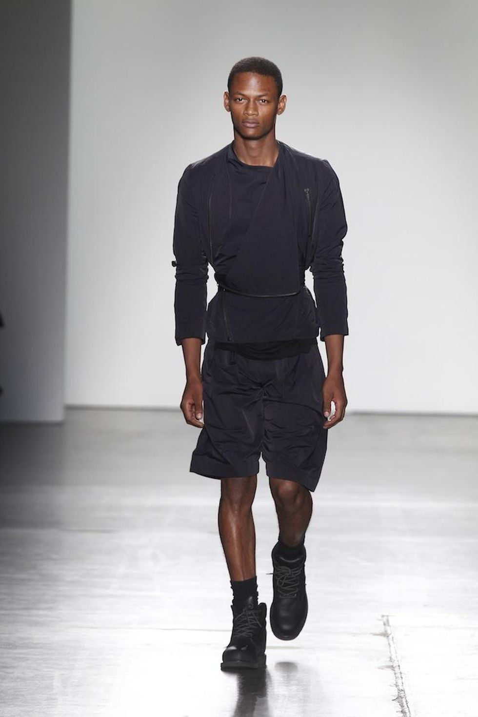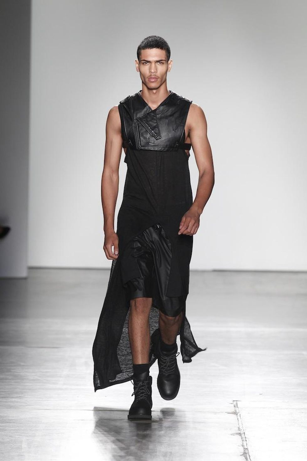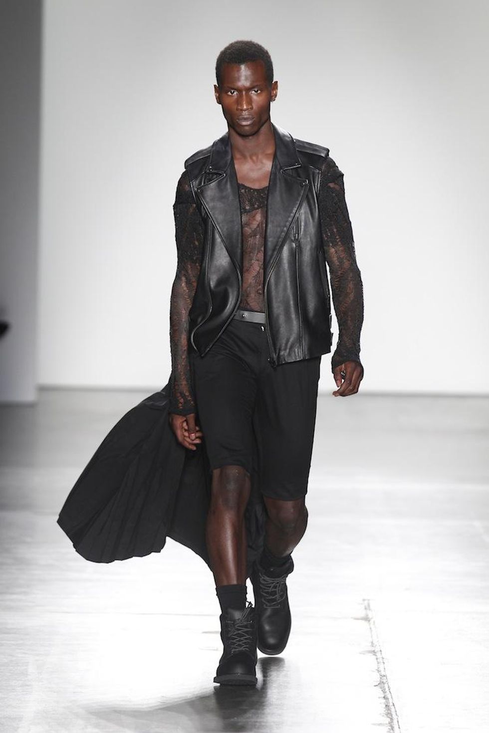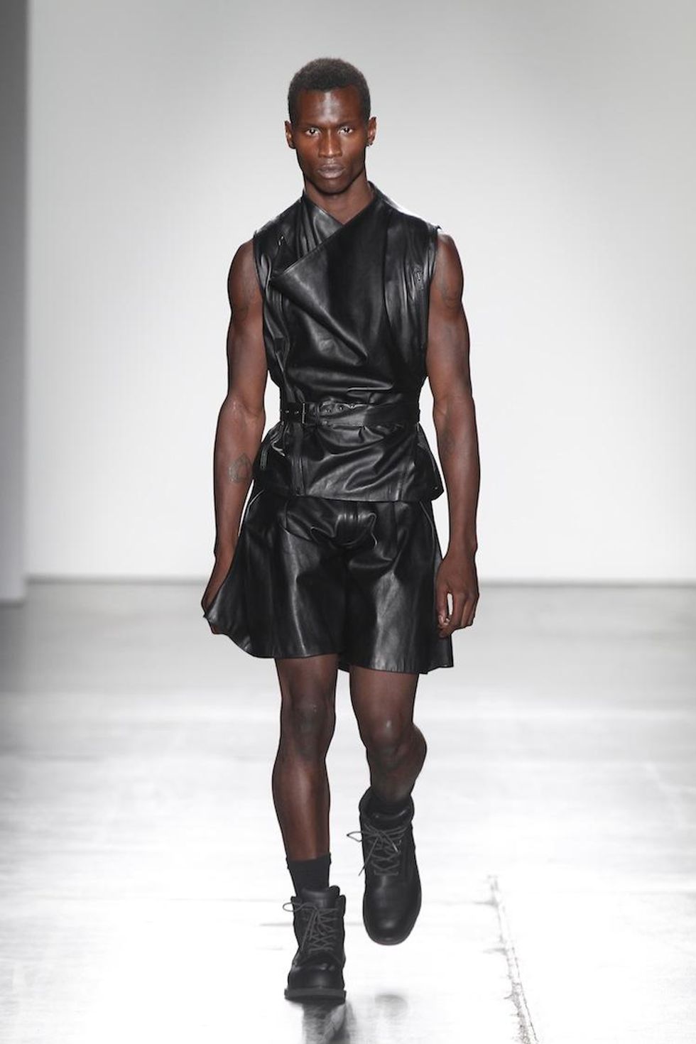The collection, entitled SYN ("with" in Greek), features extensive work on leather, with biker jackets and androgynous summer separates. We spotted rapper Angel Haze sitting front row. Click through to see the collection, which opened and closed with uber-hot model Adonis Bosso.