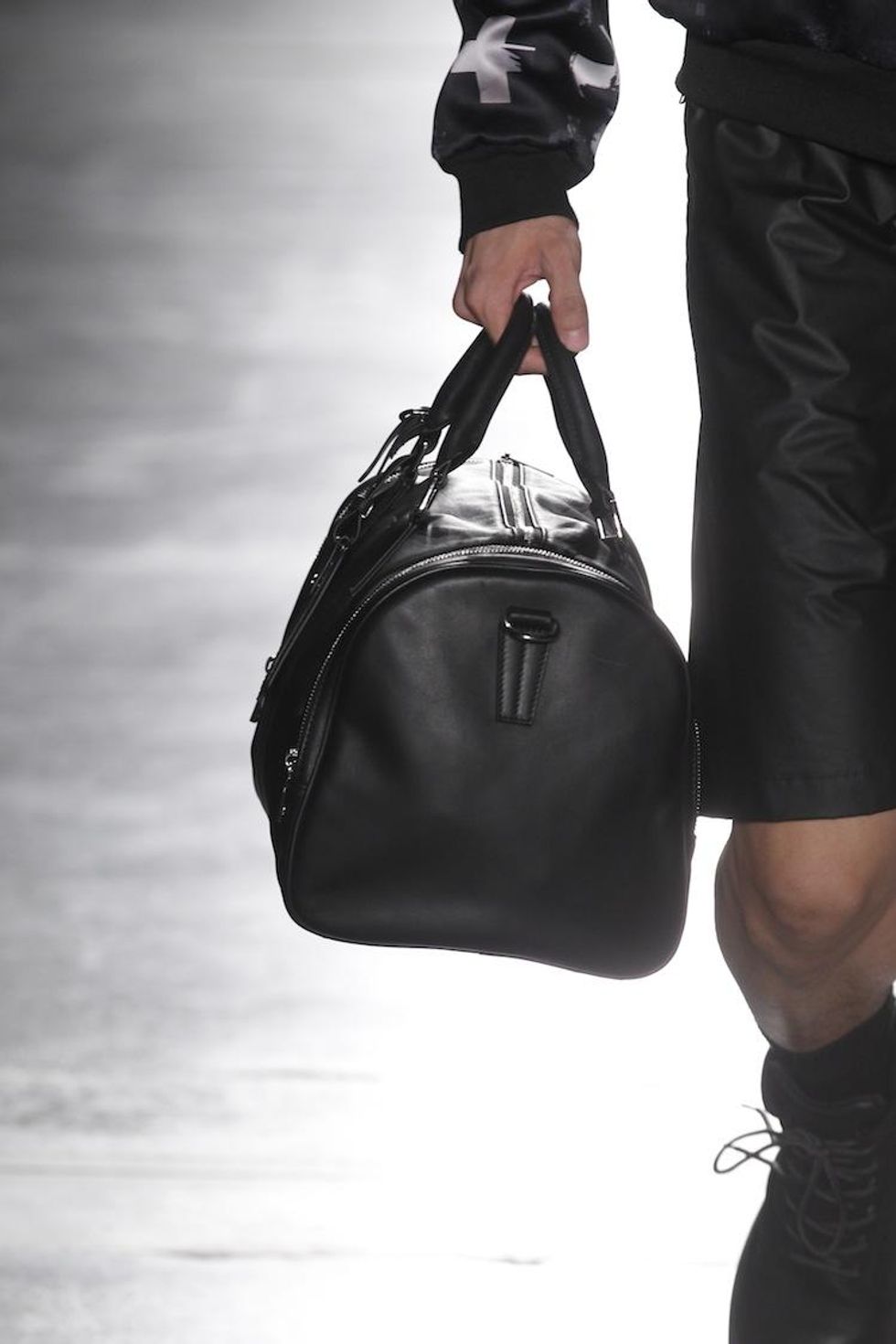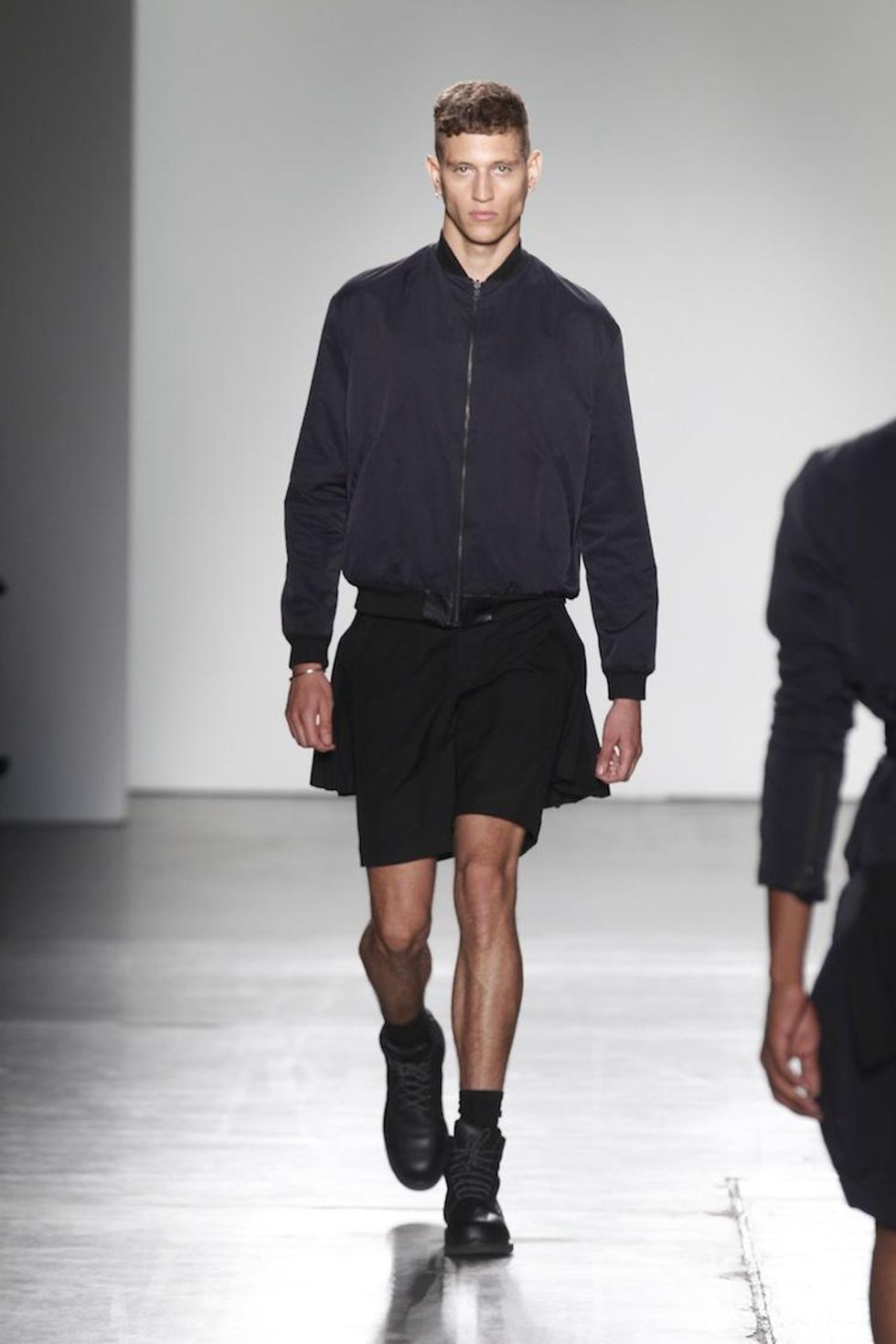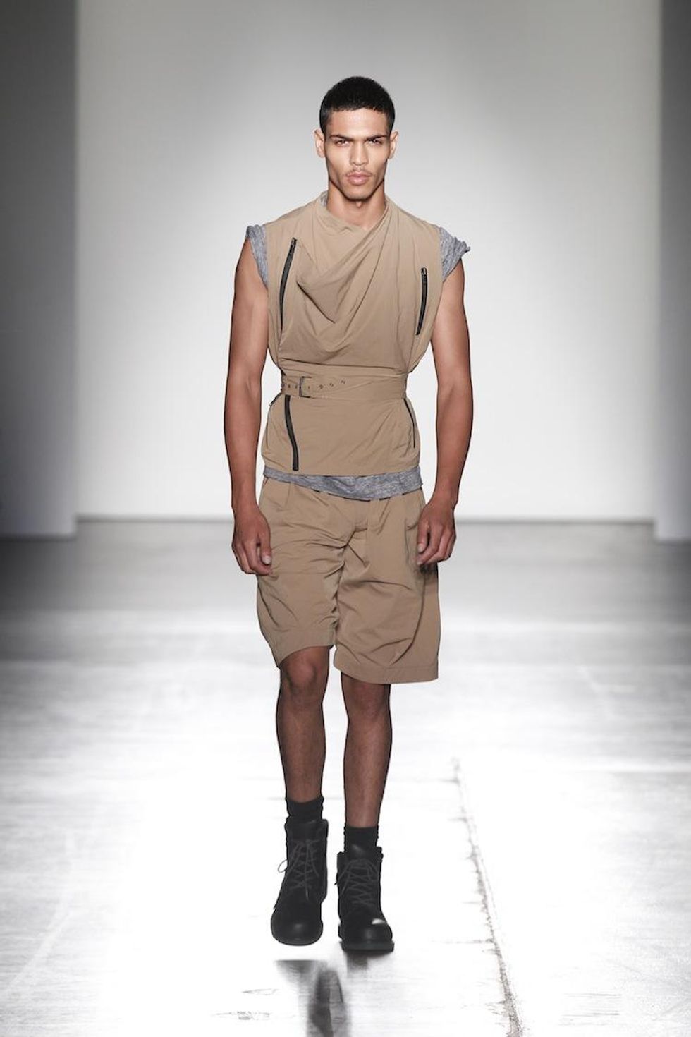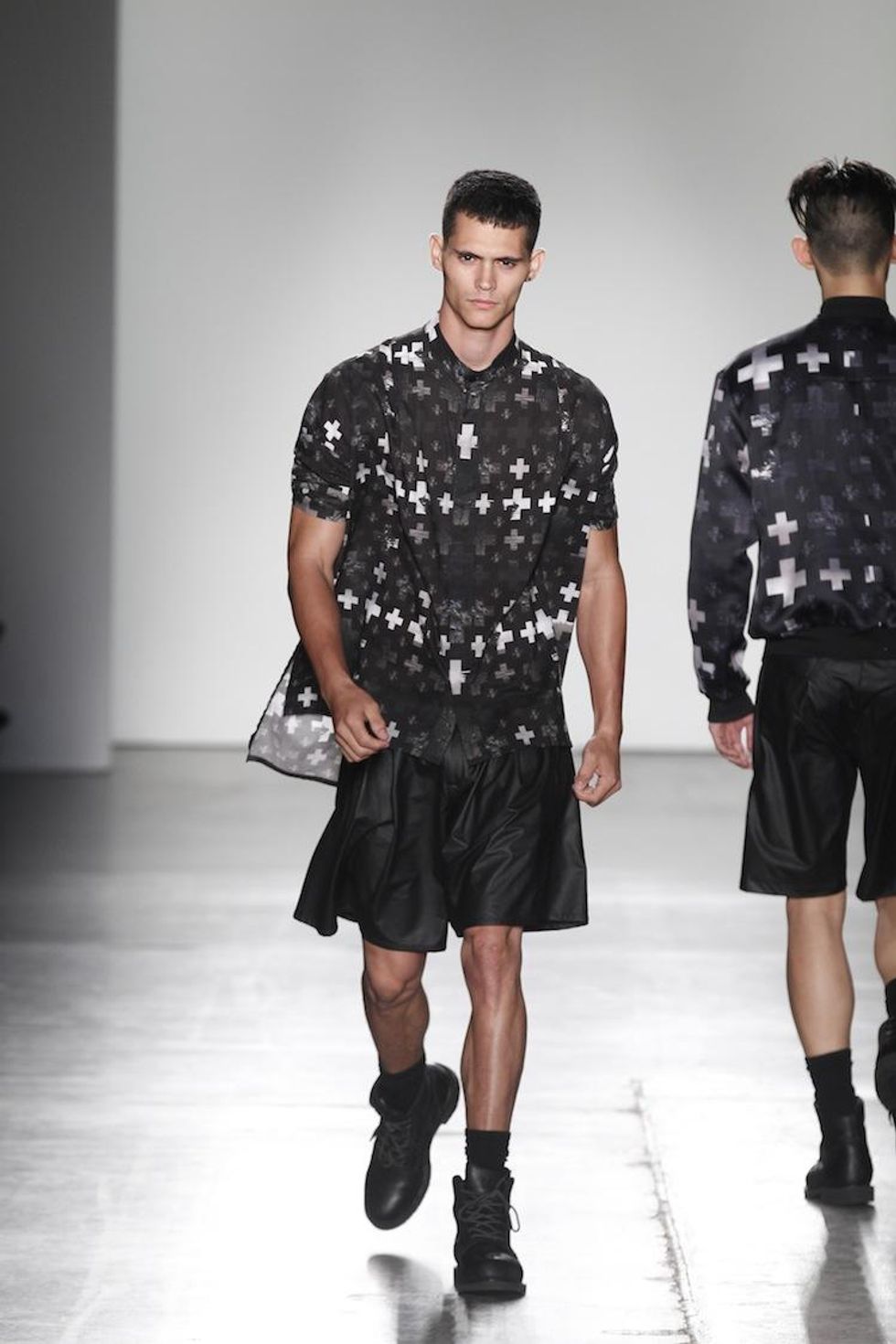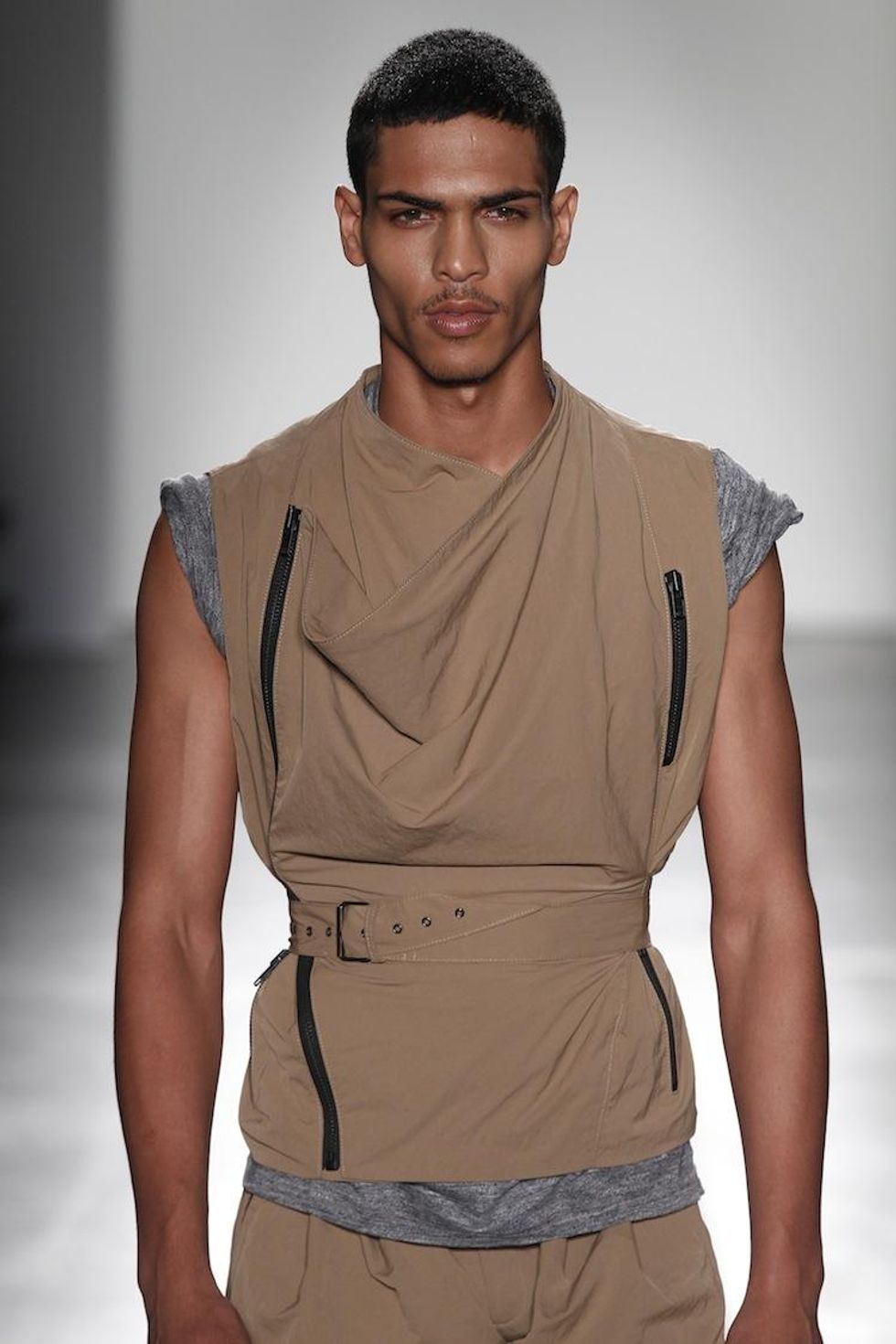 The collection, entitled SYN ("with" in Greek), features extensive work on leather, with biker jackets and androgynous summer separates. We spotted rapper Angel Haze sitting front row. Click through to see the collection, which opened and closed with uber-hot model Adonis Bosso.
