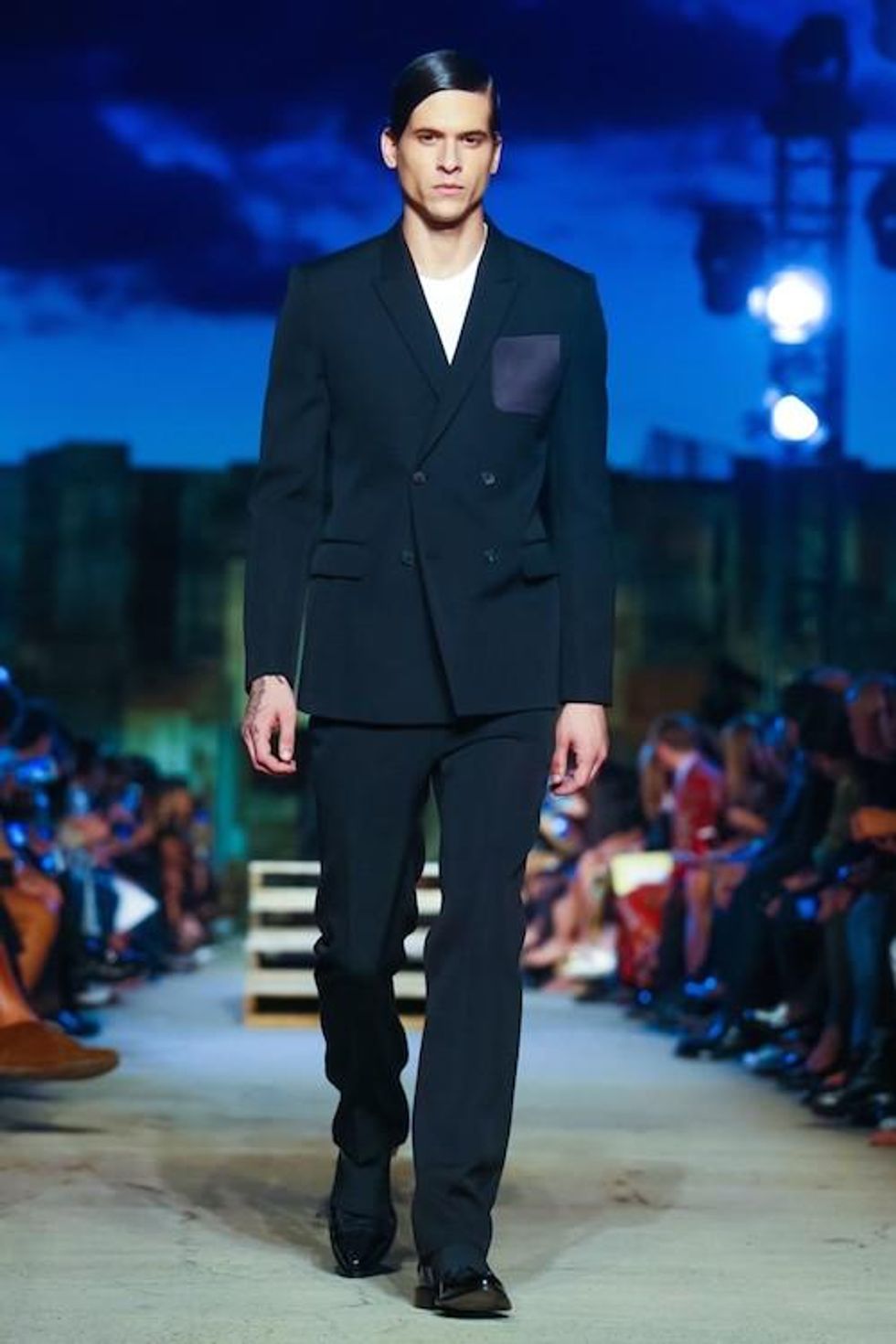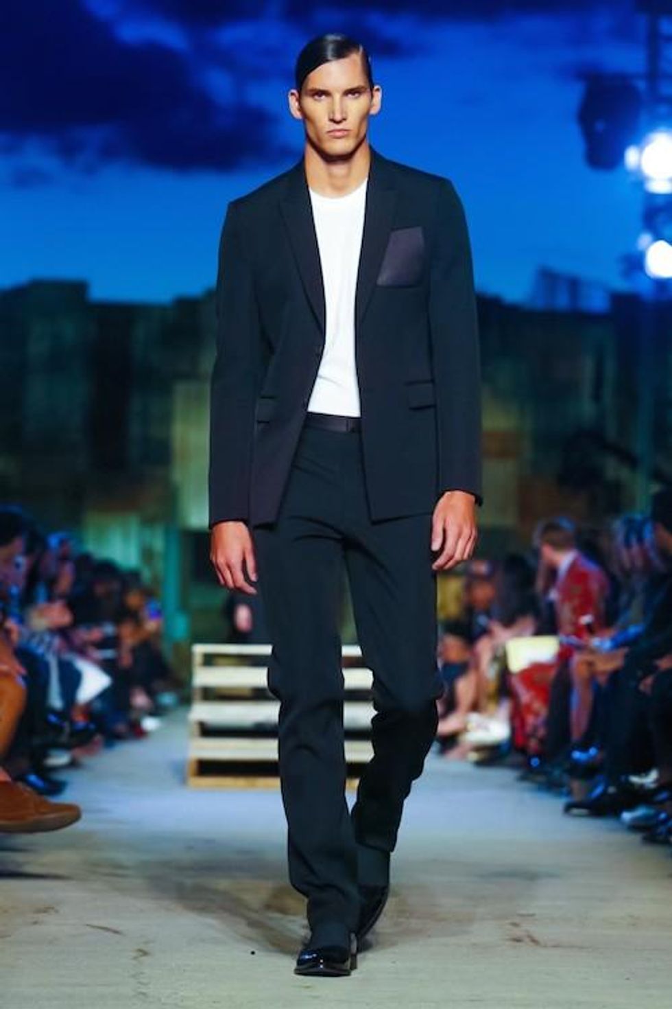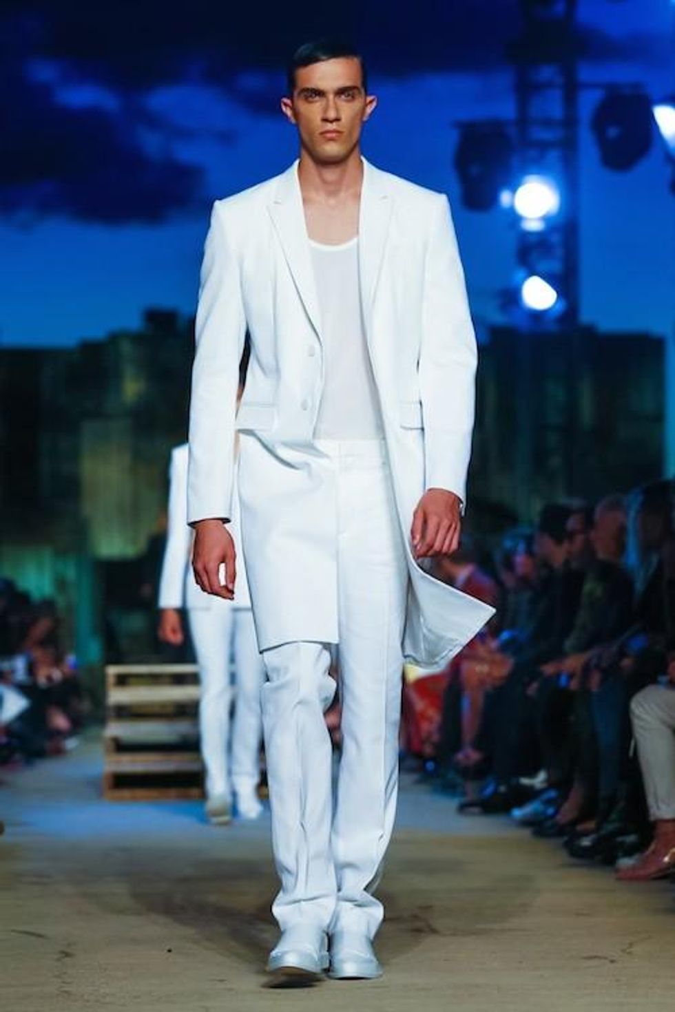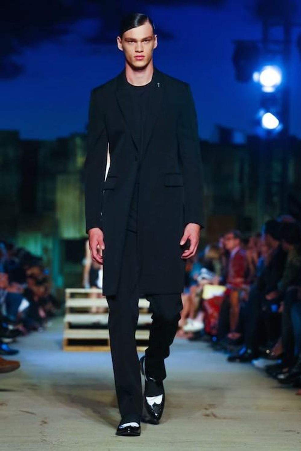 Presented on the anniversary of 9/11, Riccardo Tisci's first runway show on the New York Fashion Week schedule was solemn and artful. Over 1,000 guests in attendance watched the two light beams symbolizing the fallen Twin Towers in the distance as performance artists, choreographed by Marina Abramovic, moved slowly around the audience, perched above the runway at a pier in TriBeCa. The collection (88 looks in total) included women's and men's ready-to-wear pieces, as well as couture numbers, and pieces from the Givenchy Jeans line. Models walked to harrowing mourning songs from six different religions. Watch the full runway show at Givenchy.com
