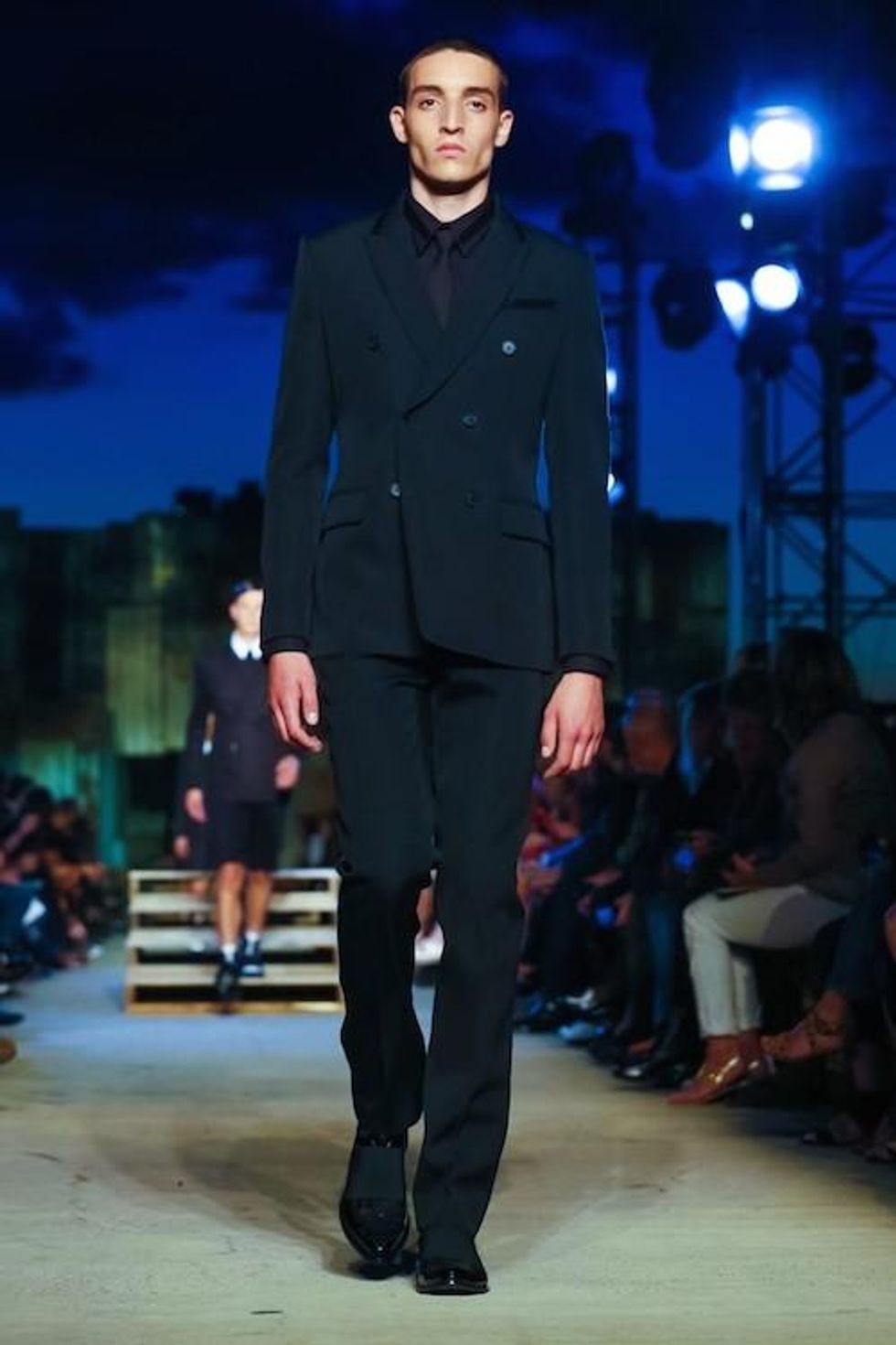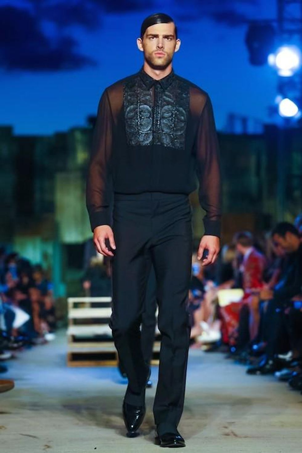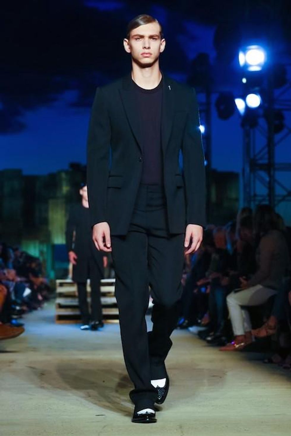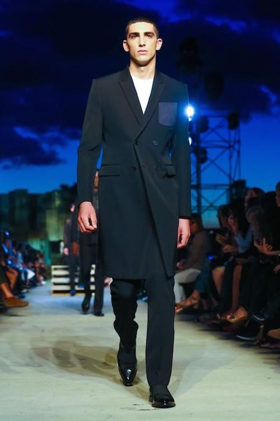 Presented on the anniversary of 9/11, Riccardo Tisci's first runway show on the New York Fashion Week schedule was solemn and artful. Over 1,000 guests in attendance watched the two light beams symbolizing the fallen Twin Towers in the distance as performance artists, choreographed by Marina Abramovic, moved slowly around the audience, perched above the runway at a pier in TriBeCa. The collection (88 looks in total) included women's and men's ready-to-wear pieces, as well as couture numbers, and pieces from the Givenchy Jeans line. Models walked to harrowing mourning songs from six different religions. Watch the full runway show at Givenchy.com