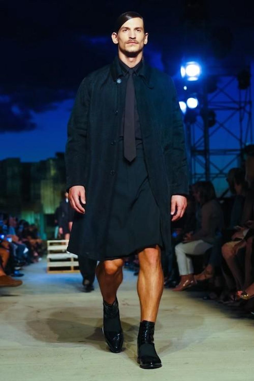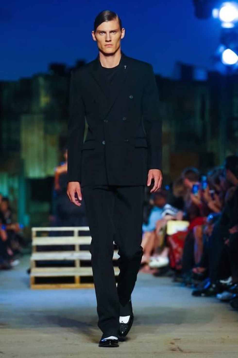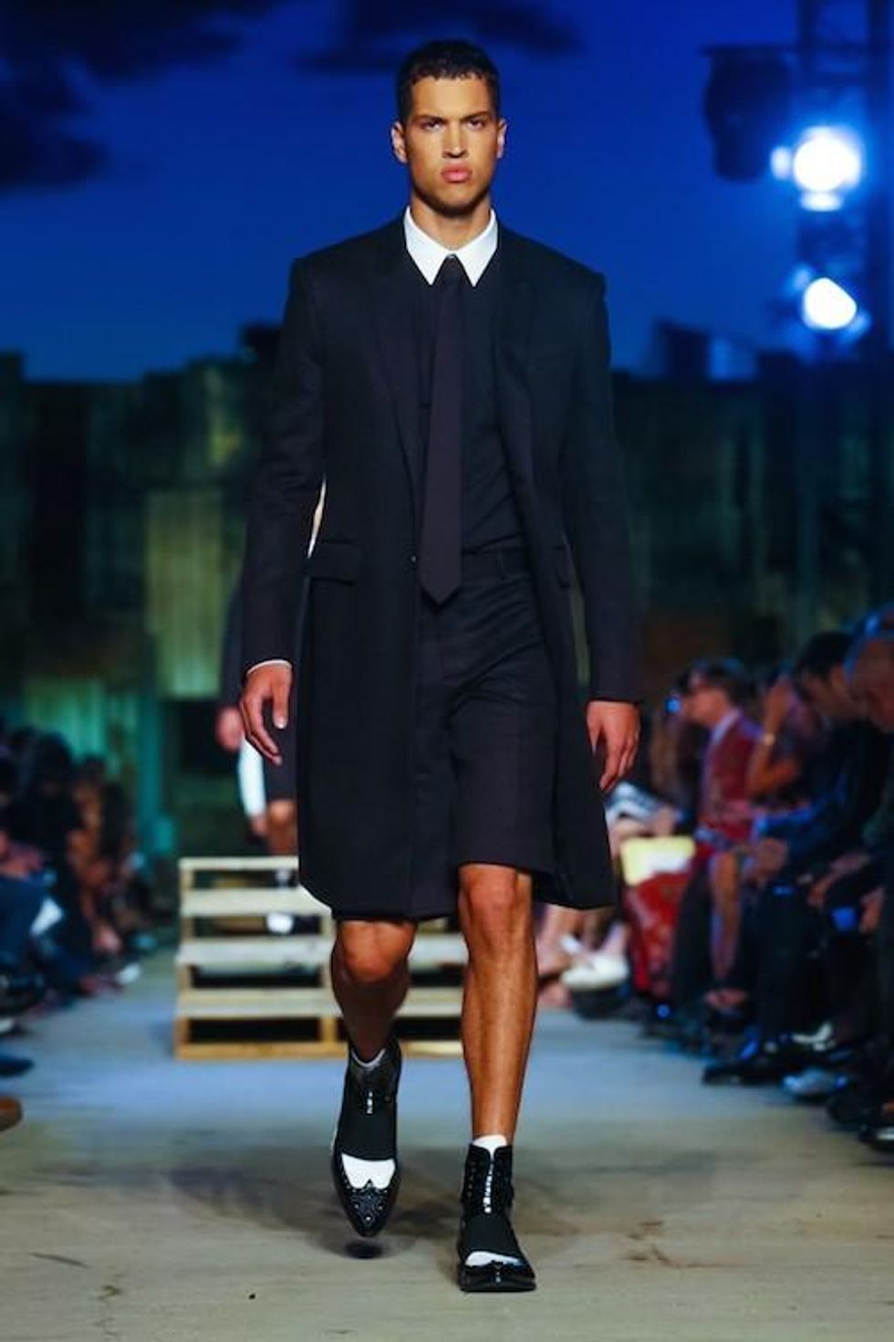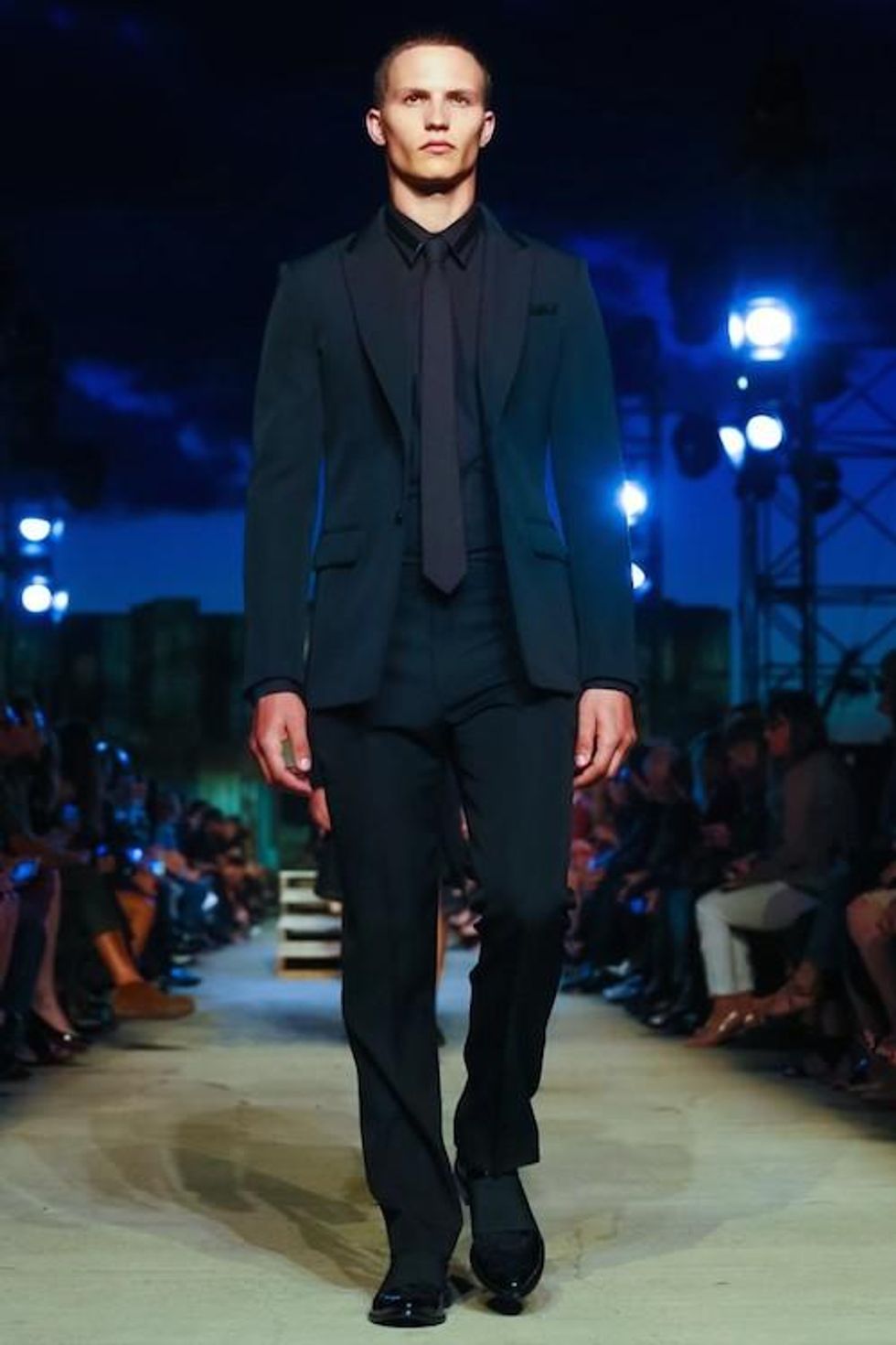 Presented on the anniversary of 9/11, Riccardo Tisci's first runway show on the New York Fashion Week schedule was solemn and artful. Over 1,000 guests in attendance watched the two light beams symbolizing the fallen Twin Towers in the distance as performance artists, choreographed by Marina Abramovic, moved slowly around the audience, perched above the runway at a pier in TriBeCa. The collection (88 looks in total) included women's and men's ready-to-wear pieces, as well as couture numbers, and pieces from the Givenchy Jeans line. Models walked to harrowing mourning songs from six different religions. Watch the full runway show at Givenchy.com