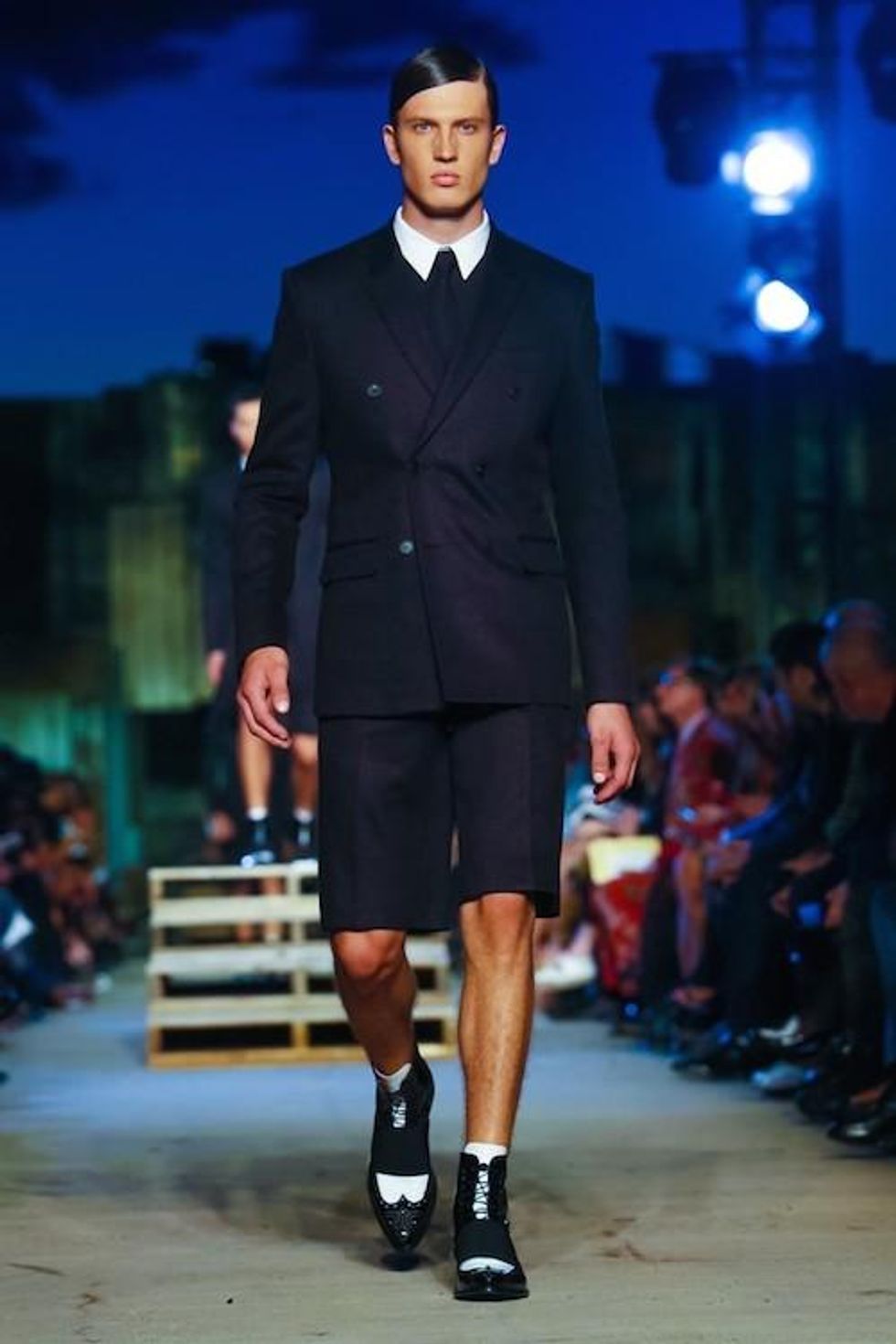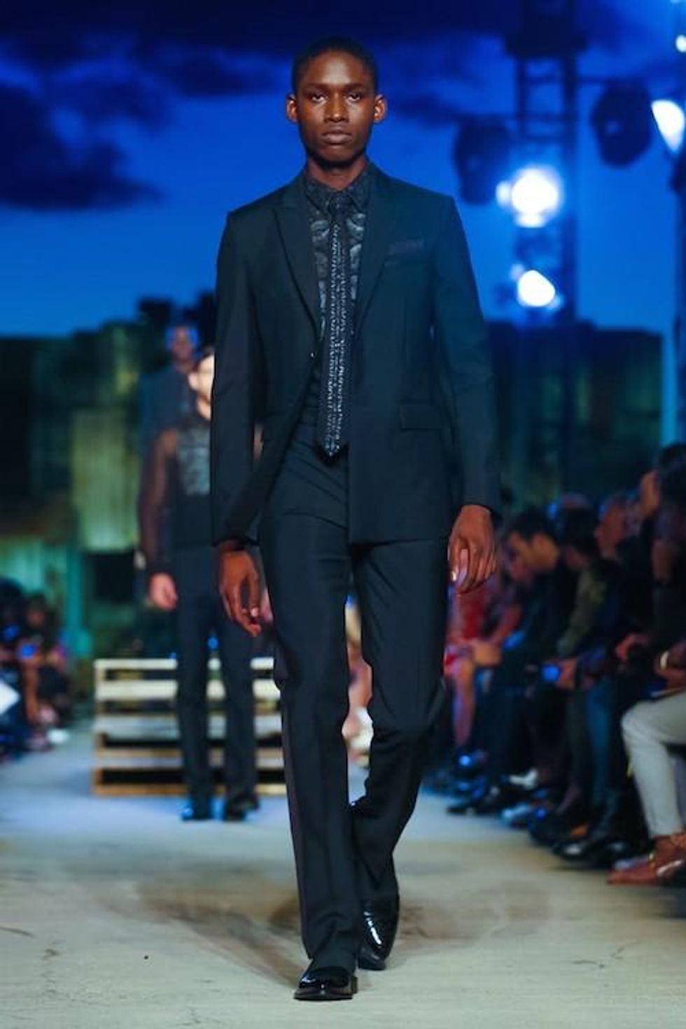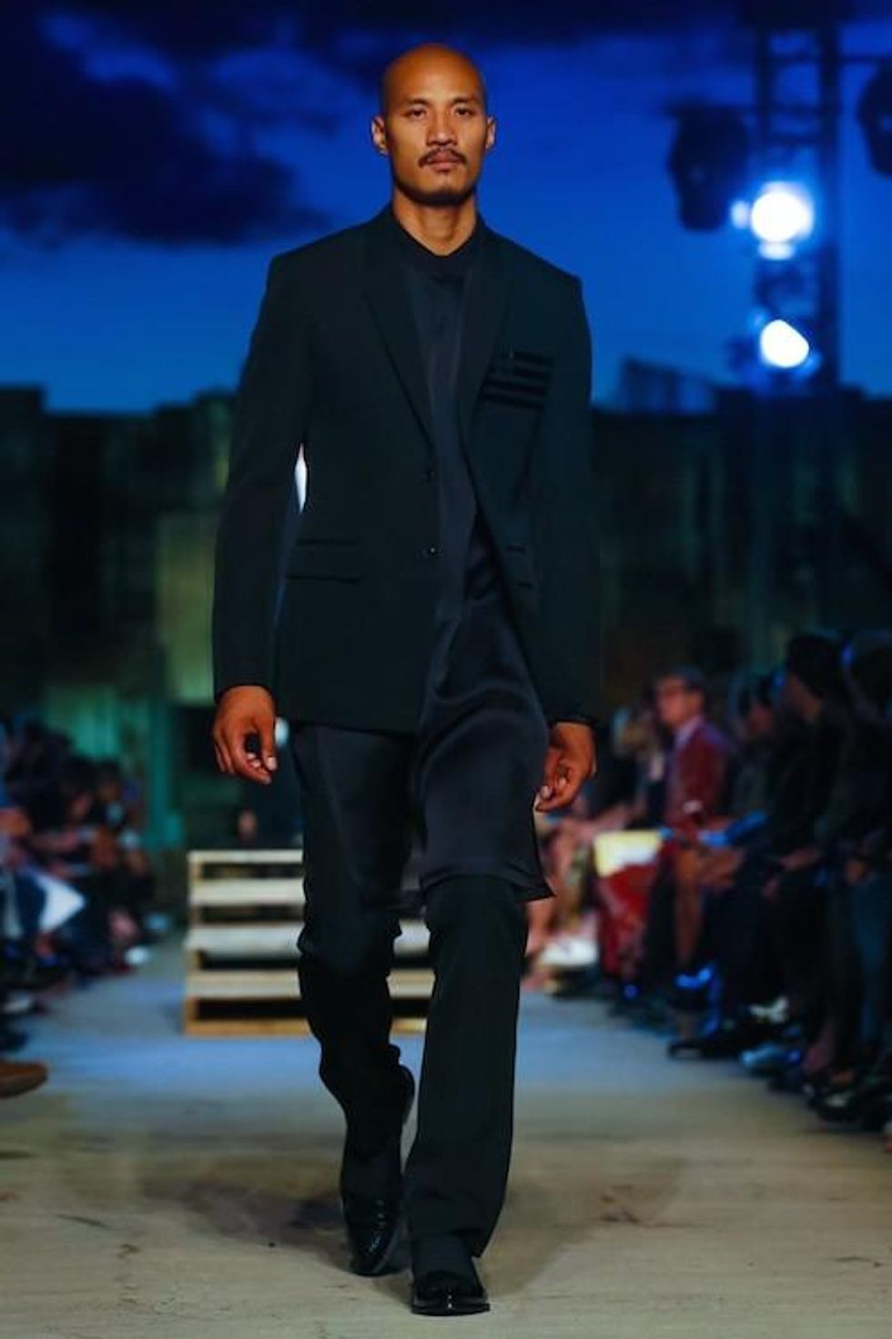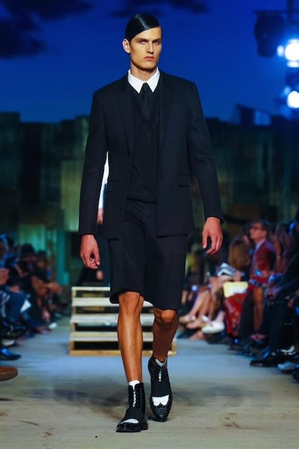 Presented on the anniversary of 9/11, Riccardo Tisci's first runway show on the New York Fashion Week schedule was solemn and artful. Over 1,000 guests in attendance watched the two light beams symbolizing the fallen Twin Towers in the distance as performance artists, choreographed by Marina Abramovic, moved slowly around the audience, perched above the runway at a pier in TriBeCa. The collection (88 looks in total) included women's and men's ready-to-wear pieces, as well as couture numbers, and pieces from the Givenchy Jeans line. Models walked to harrowing mourning songs from six different religions. Watch the full runway show at Givenchy.com