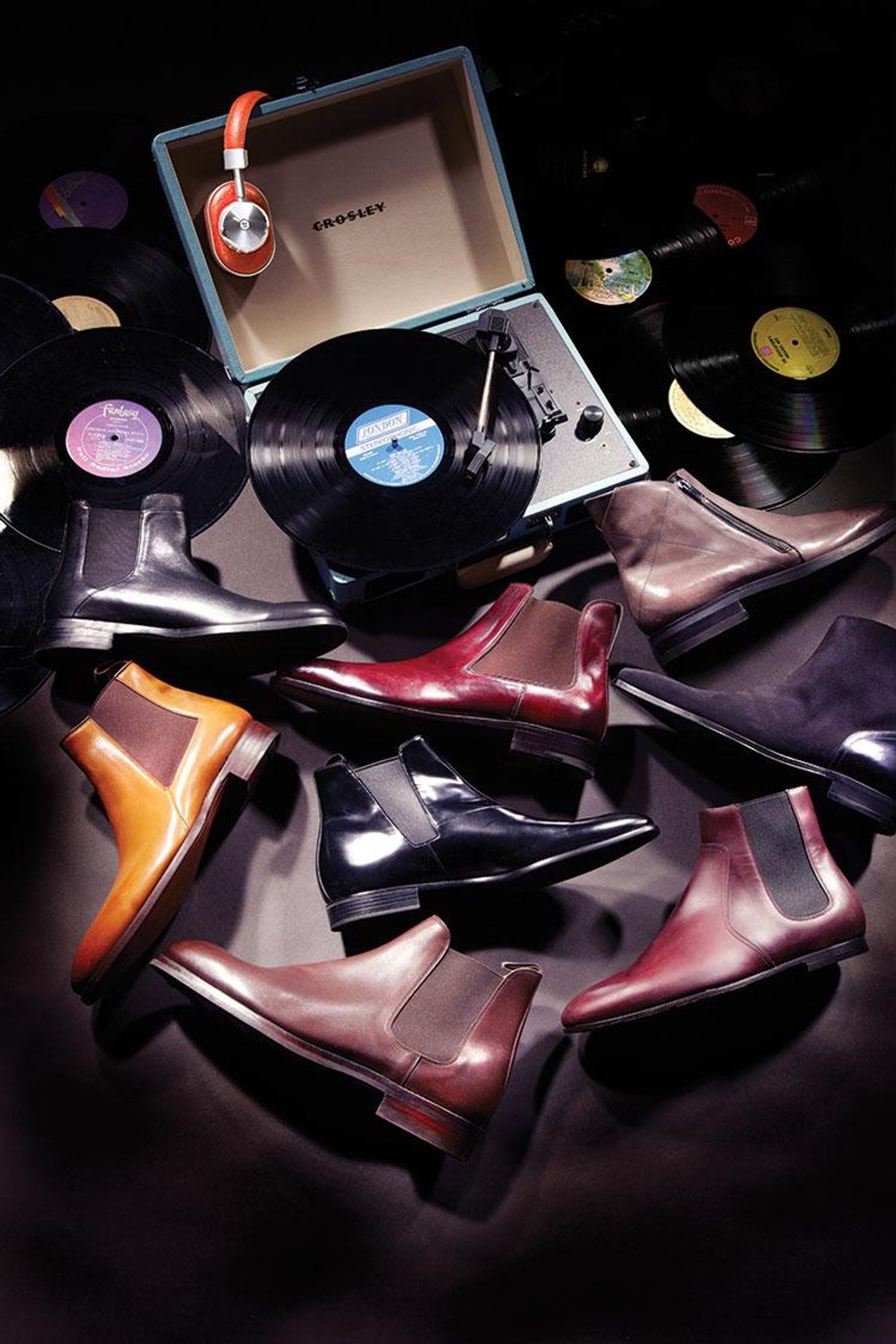 Top row from left: Cole Haan, $248; Salvatore Ferragamo, $1,400; Ermenegildo Zegna, $1,395. Middle row from left: Tommy Hilfiger, $279; Prada, Price available upon request; Dior Homme, $1,180. Bottom row: Ralph Lauren, $995; Burberry, $775. Headphones by Master & Dynamic, $549