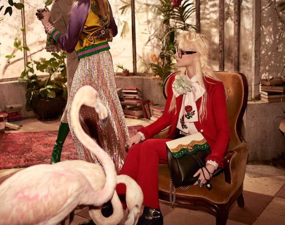 Gucci's new campaign for pre-fall 2016 is set in a glass-domed tropical aviary where wild plants and wandering flamingos move freely across patterned rugs and among piles of old books. A surreal riot of colours, textures, and movement recall the spirit of Gucci's new flora and fauna-based prints --loved by the likes of Beyonce, Florence Wlech, and Rihanna. Populated by a cast of carefree characters, the campaign is an exploration of the bizarre and the eccentric in an eye-popping wonderland where more is definitely more.