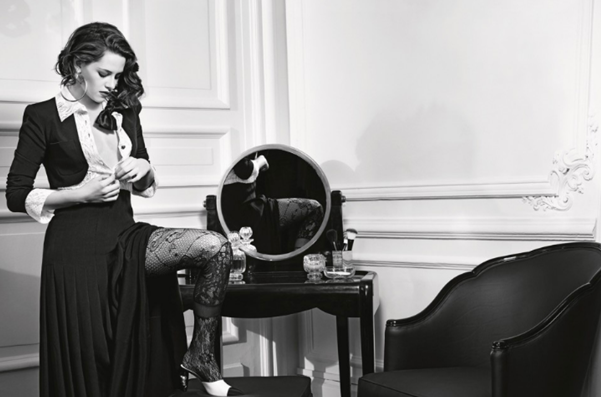 Stewart spends the 30-second spot sexy-walking around a Paris apartment in black lace tights, a fitted black dress, big hoop earrings, and a tulle jacket. She takes some of these things off in the video. "I'll Take Care of You," covered by '70s poet Gil Scott-Heron, plays in the background.