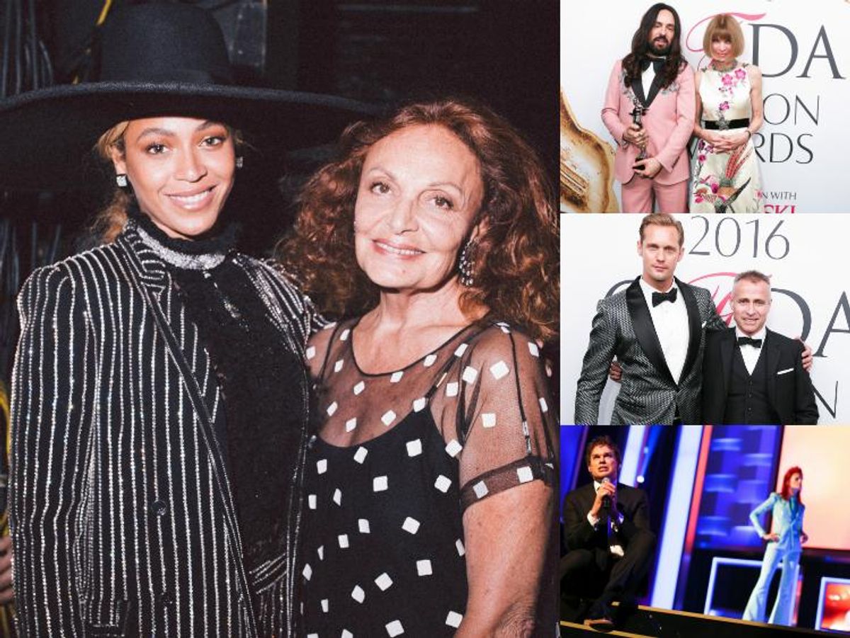Pictured: Beyonce and Diane von Furstenberg (left), Gucci's creative director Alessandro Michele and Anna Wintour (top right); Alexander Skarsgard and Thom Browne (center right); Michael C. Hall performing a tribute to David Bowie. (Photo: Courtesy of CFDA)