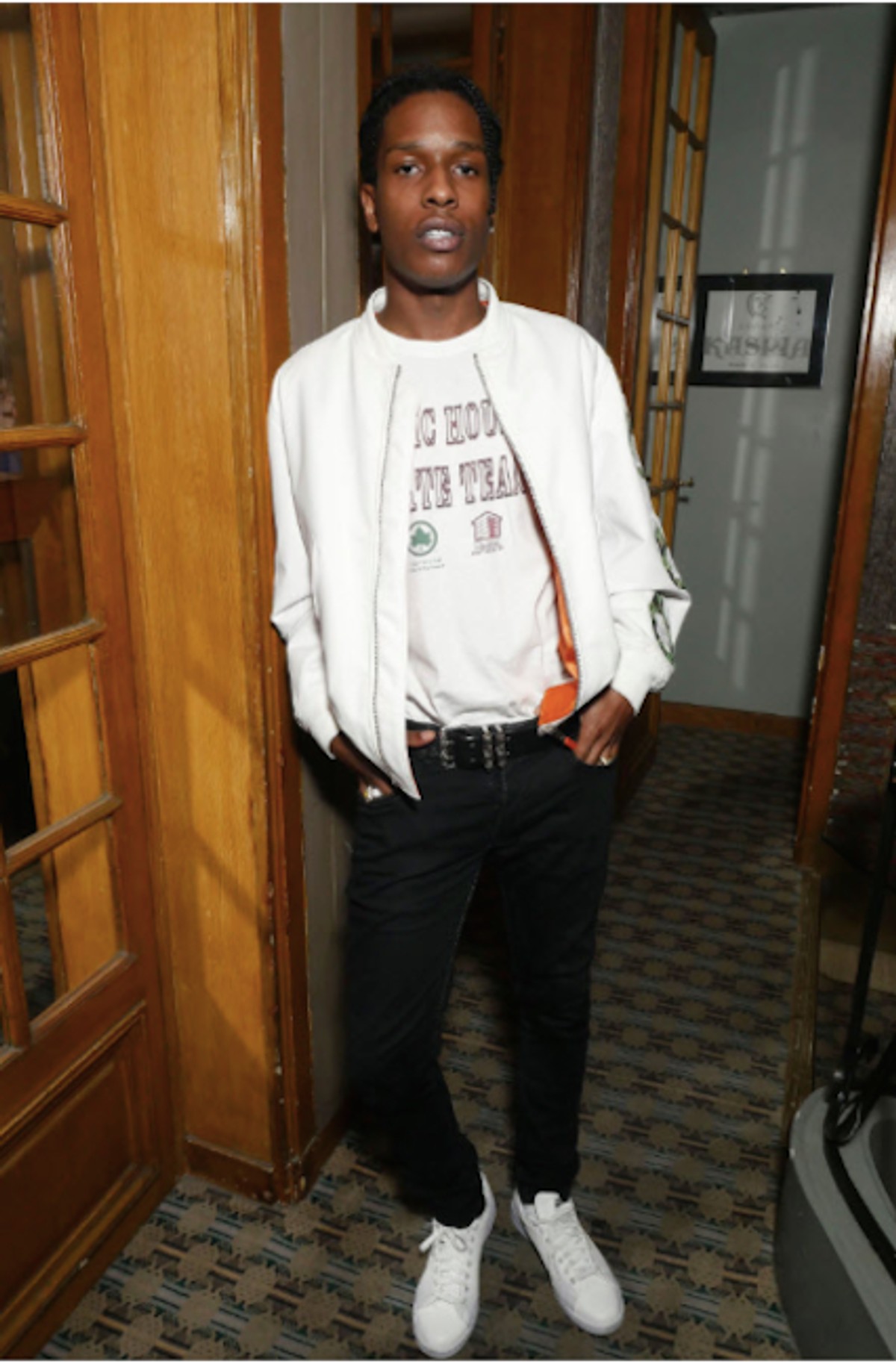 Later, for his after-party look (above), at the Dior post-show celebratory dinner, he showed how a simple logo tee and jeans could look so well put-together just by using the right fit and accessories: He upgraded his getup a white leather bomber, also by Dior Homme.