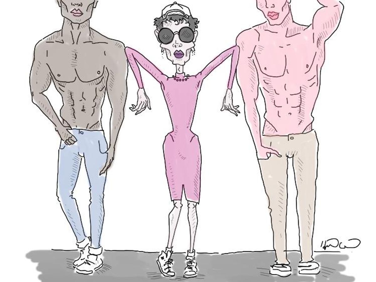 For the purposes of this story, let's say I'm a man. I've got all the pre-reqs, after all. While I'm certainly no Vin Diesel (see the above illustration...I'm in the middle), I've got enough wispy hairs on my chin and a certain thickness to my throat to cause strangers on the street to often do a double take when they see me, glammed out in black cherry lips and a floor length floral midi skirt. And while the fashion world is absolutely one of the most progressive communities on earth in terms of gender identity, you can imagine I felt a mild apprehension as I strode up to Industria Superstudios on Wednesday morning in the West Village, preparing to conduct a string of interviews and to surround myself with some of the hottest, frattiest male models in town.