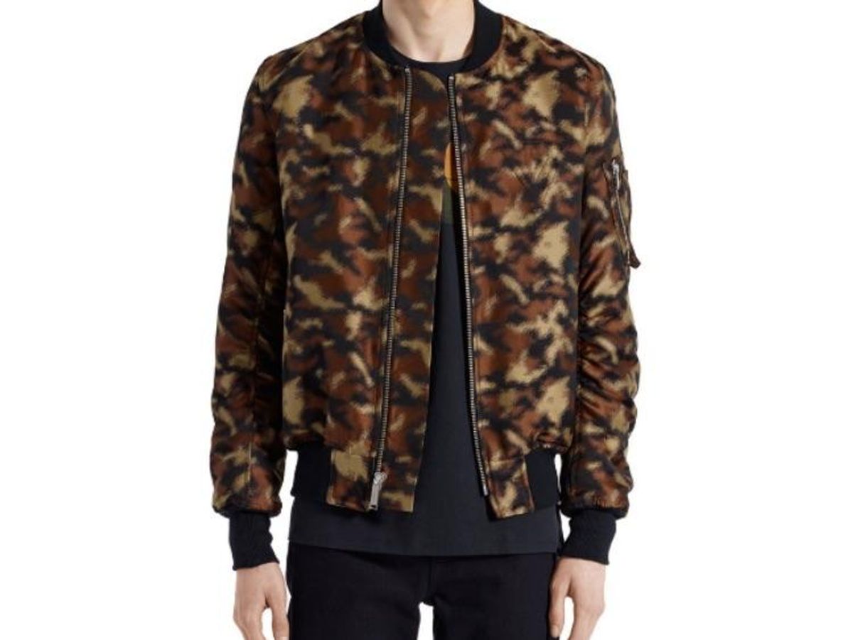 The Erek Flight Bomber Jacket from Public School turns hunting birds into high fashion. The lustrous camouflage jacket brings a Midwestern/Americana vibe to an otherwise modern piece. With silver zippers and black ruching detail, it's certainly a staple that you'll be extra happy to have come fall.
