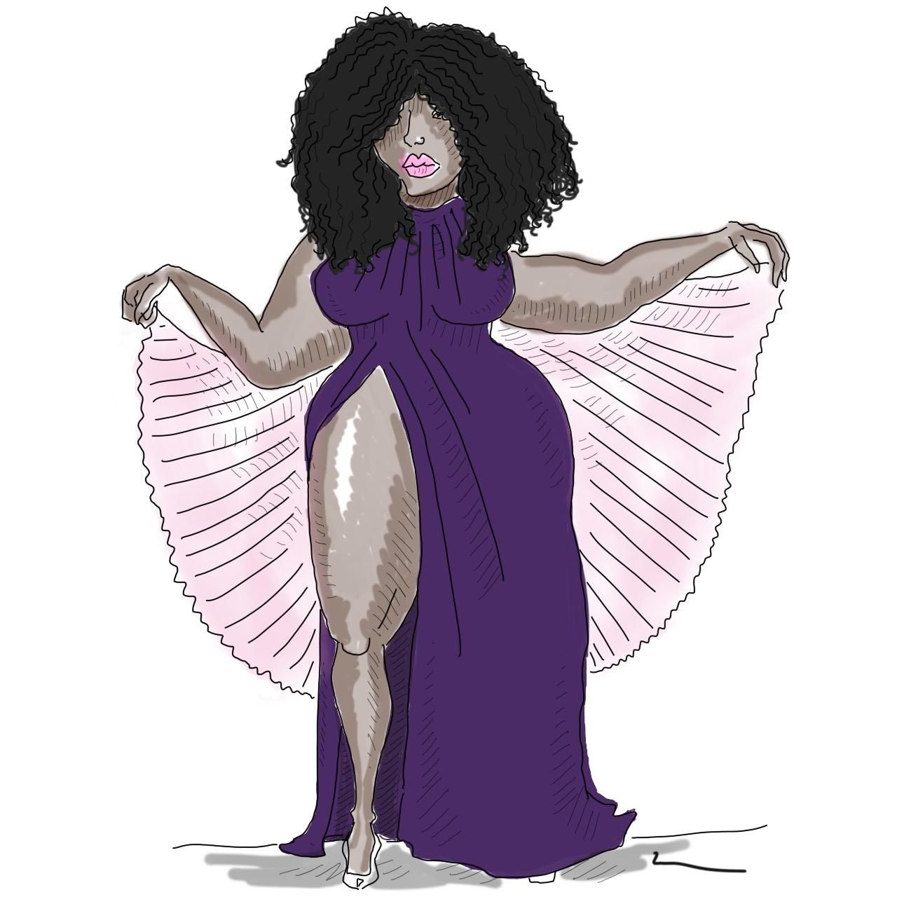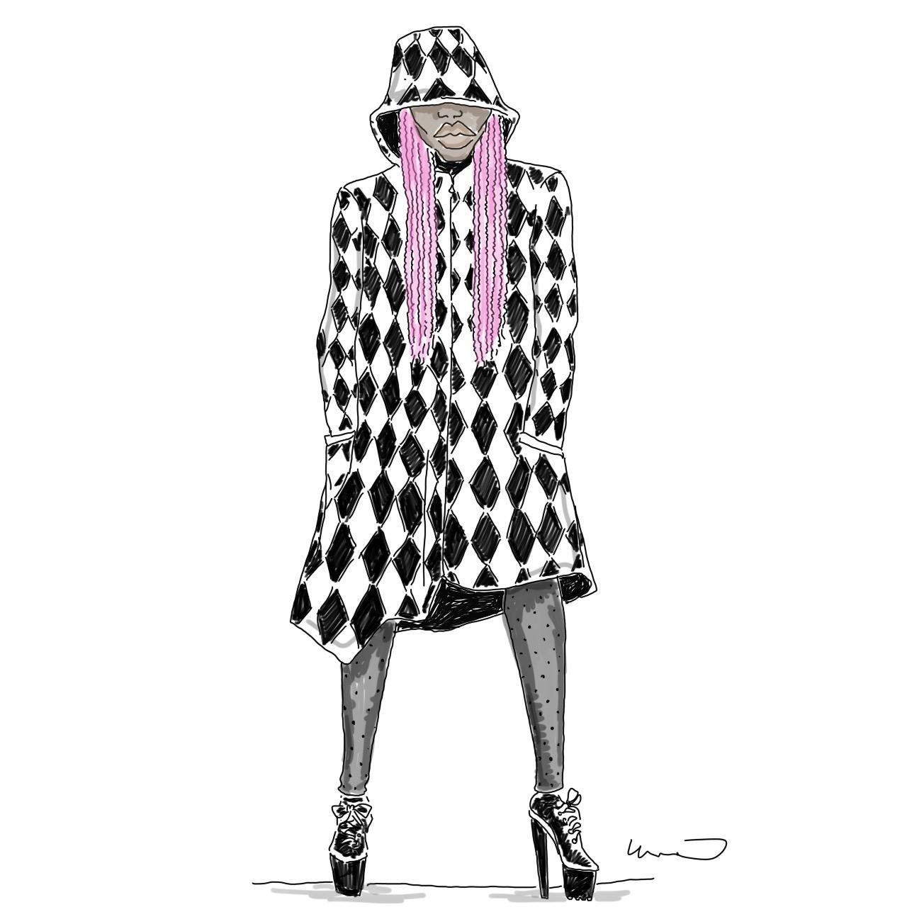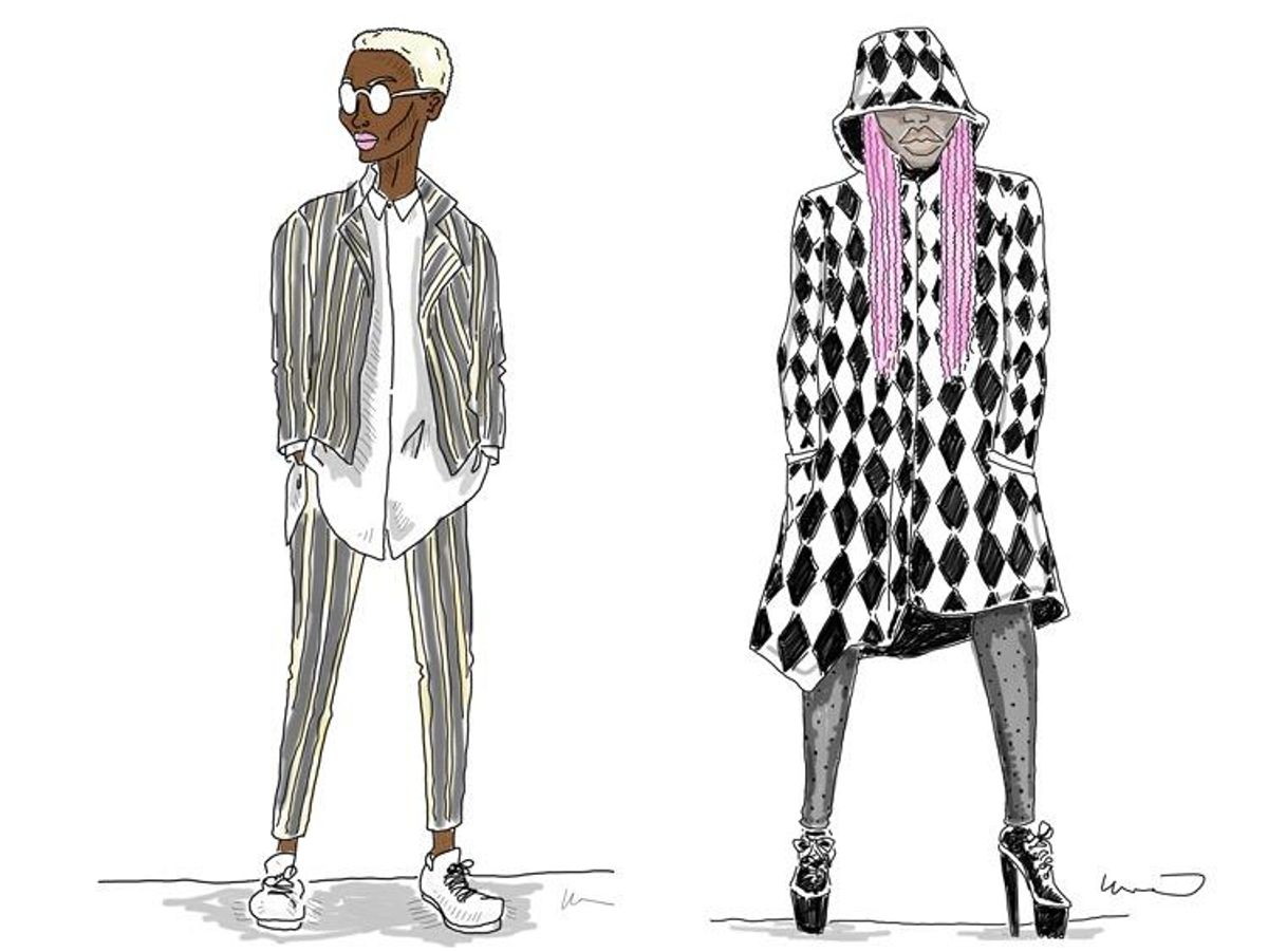 Illustration by Hilton Dresden. Model wears a Stuzo design.