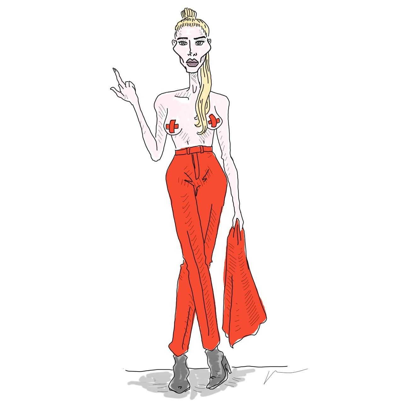 This girl seemed like she was giving a typical runway walk--that is, until she ripped off her Sharpe Suiting blazer, exposing some curiously placed nipple tape, and flipping off the audience to massive cheers.
