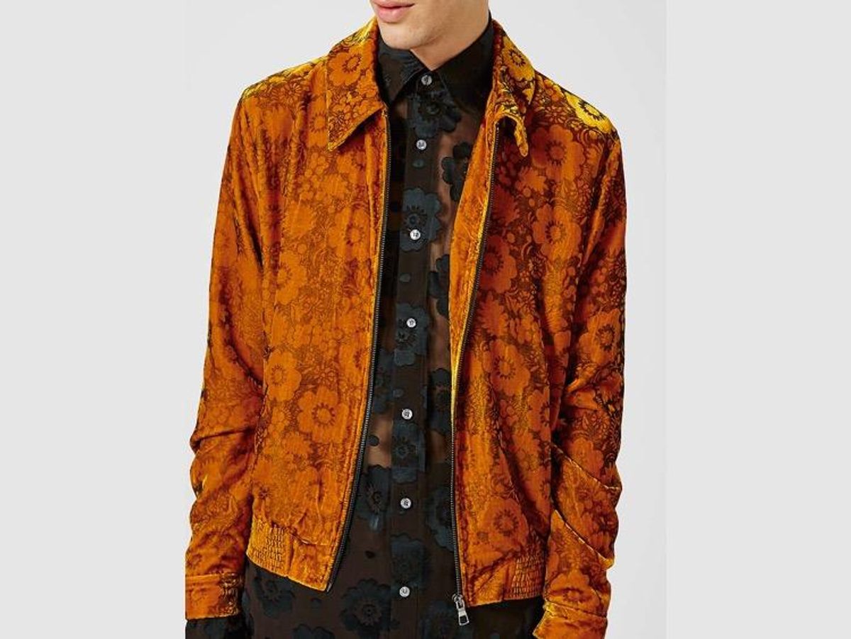 The Orange Floral Burnout Harrington Jacket, complete with classic collar, button cuffs, and elastic waist, is $500 on Topman.com.