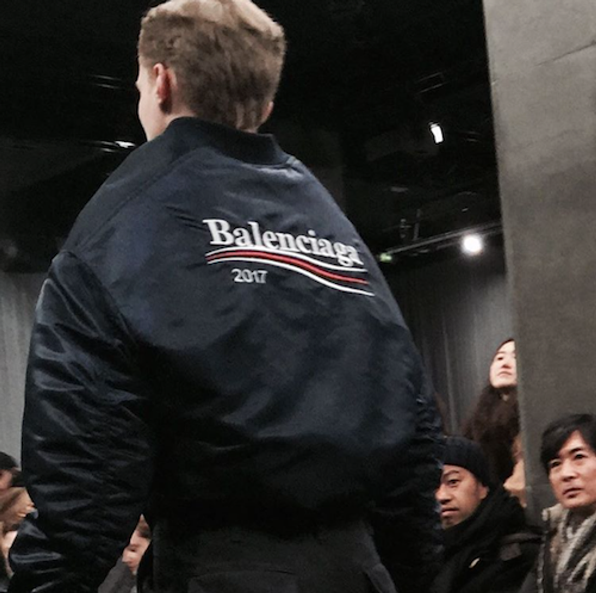 For Balenciaga's fall '17 collection, Gvasalia was still "Feeling the Bern," reappropriating Sanders' iconic logo onto the backs of bomber jackets. With Democrat Blue as the collection's feature color, this season delivered outerwear that calls for the campaign of "Balenciaga 2017."