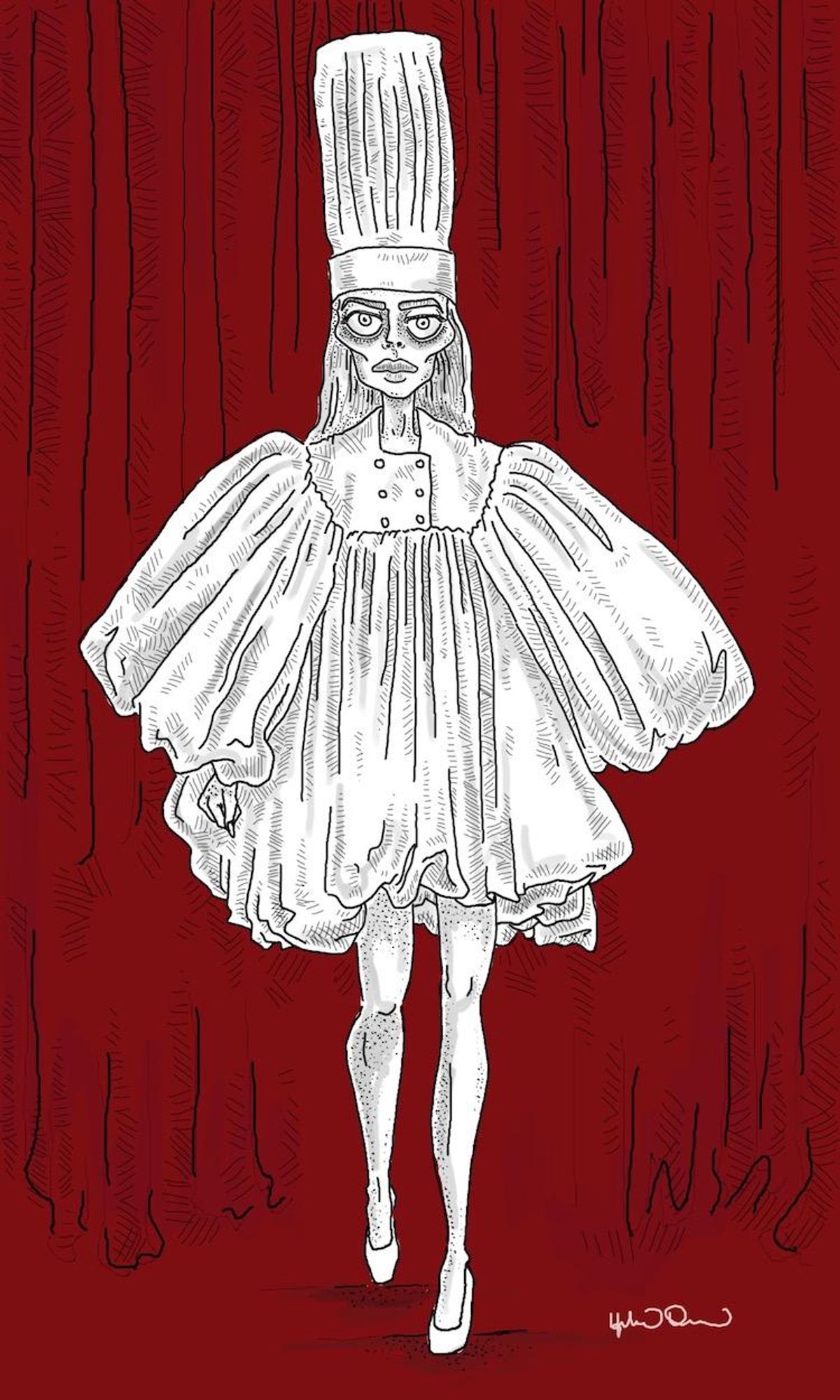 On their favorite pieces from the collection, Vaquera said, "It's exciting to make something super wearable, but I think we get the most excited about our more conceptual show pieces. The American Flag debutant dress, melting Oscar gown and chef/bride were all standouts this season."