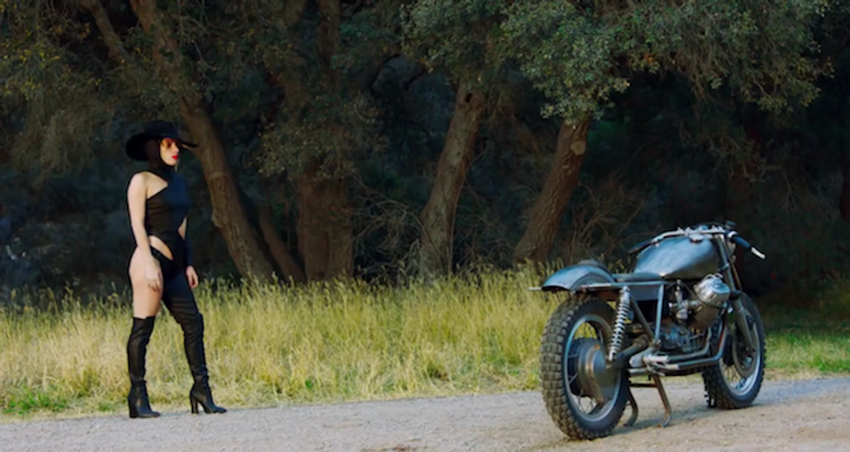 Among the range is Christian Cowan, who recently made his NYFW debut with a cameo from "Stars Are Blind" songstress Paris Hilton. The London College of Fashion graduate has worked with Gaga before, dressing her in a full hot pink glitter suit with a matching wide-brimmed selfie hat. No stranger to pop stars, Cowan has dressed everyone from Miley Cyrus to Charli XCX amd Tove Lo--his colorful, over-the-top aesthetic a favorite among the music industry's most flamboyant. In "John Wayne," Gaga wears Cowan's sexy full-body catsuit, while racing after her tumultuous lover on a motorcycle.