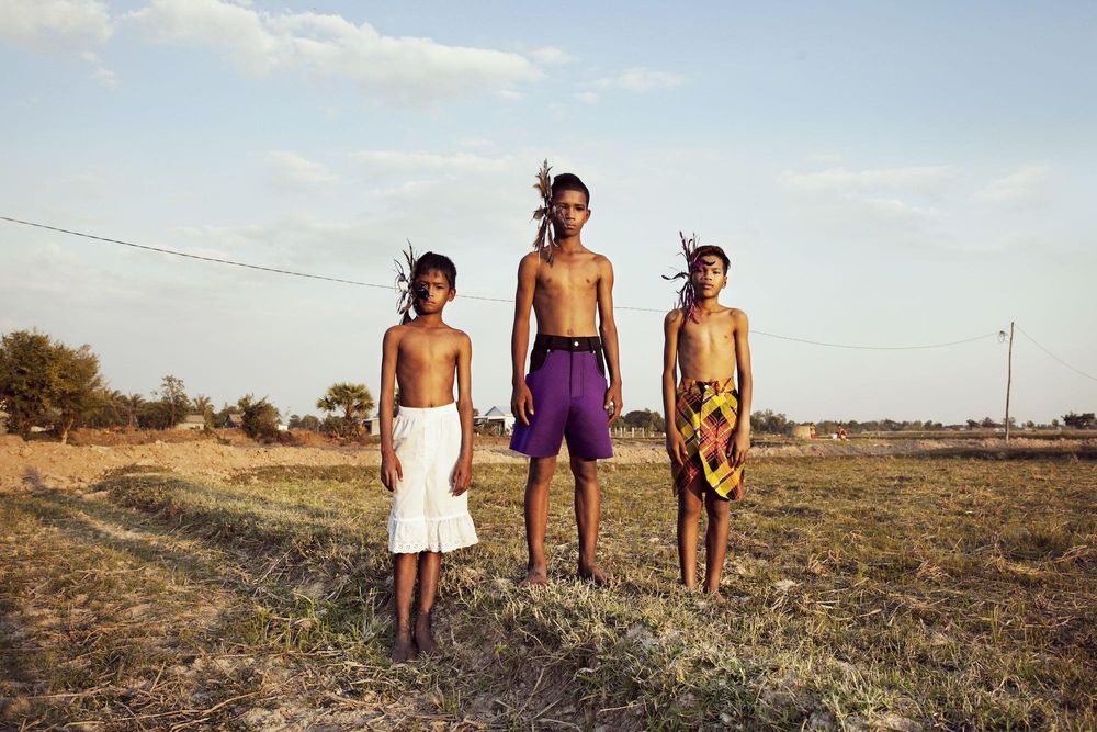 The photographer also shot in his Grandmother's tiny village, called Oudong, which has no running water, plumbing, postal services, Internet or garbage disposal. "She sleeps in a small wooden house with caretakers and their sons," Ouk says of his Grandmother. While visiting her home, Ouk also shot his Great Aunt, as well as a shy boy who followed him around for days. "He was very into the clothes, but too shy to admit it," Ouk says. "He finally got the courage to step in front of the lens" and modeled Gypsy Sport's feather crown, designed in collaboration with queer jewelry-maker Chris Habana.