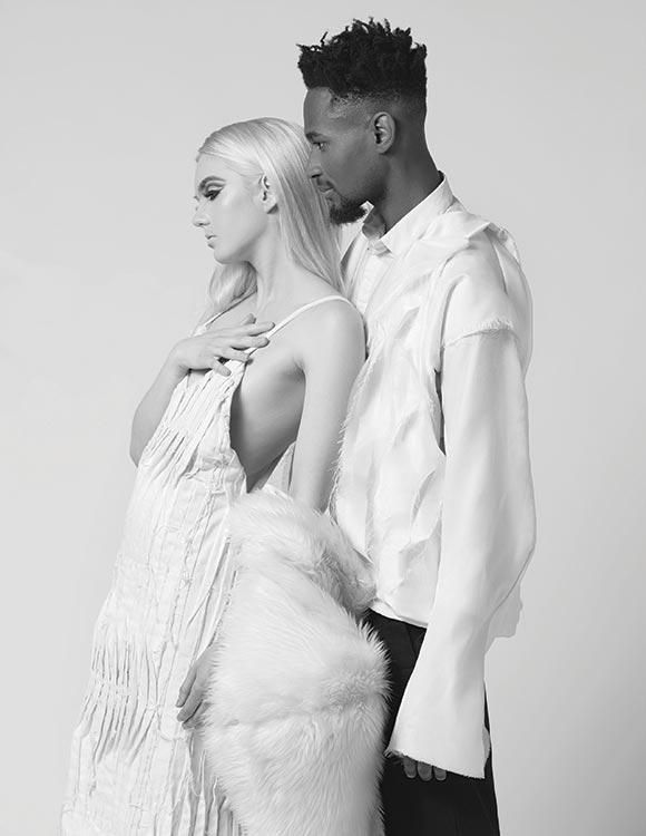 All Clothing: DaShaun Hightower (On Hightower: Aberrant Jacket, On Abigail: Shredded Tide Dress & Organic Cape)