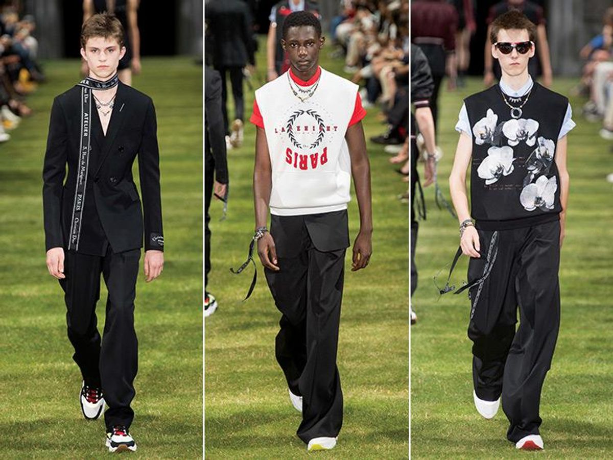 One can detect a wistful and more relaxed energy in the looks Van Assche has unveiled for his spring 2018 collection, marking the 10-year anniversary of his first one. Those black suits are nipped in at the waist (a nod to Dior's iconic New Look), and some were made by draping the fabric on the body, like a dress. His new graphic T-shirts are stamped with the address of the men's atelier. Oversize floral prints, varsity jackets, and billowing pants hint at the ease and dreaminess of youth. Is the minimalist revealing his romantic side? Anniversaries will do that.