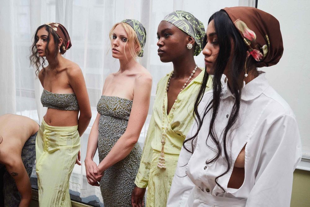 For spring '18, the Gauntlett Cheng girl wore floral silk headscarves, vintage grandmothers' jewelry and scuffed white sneakers--loosely referential to Brooklyn's Hasidic population. They found unexpected ways to reveal skin that felt at once childlike and mature: a strapless dress with repeated horizontal slashes down the body, and collared day dresses with slits subtly revealing models' breasts. Through these smart details, the collection delivered an unusual balance of shy softness and provocative confidence.