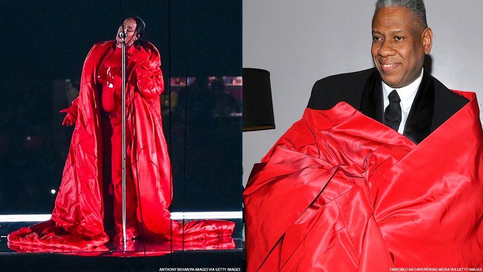 During a part of her performance, Rihanna put on a giant over-sized, floor-sweeping red leather Alaïa puffer jacket that was reminiscent of legendary Vogue editor André Leon Talley’s iconic signature red Norma Kamali sleeping bag coat.