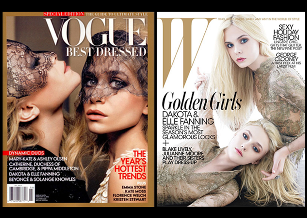 2011 is surely shaping up as the year of the sibling. It's as if every celebrity in town shook their family tree and raining down like leaves came a new generation of matinee idols and starlets. Beyonce has Solange, James Franco has Dave, and Princess Kate has Pippa. Now, Conde Nast's two biggest lady's fashion mags--W and Vogue--are featuring pairings on recent covers. For Vogue's special-edition "Best Dressed" issue, Mary-Kate and Ashley Olsen gaze out blankly from the cover with their doe-eyes. On W, it's the Fanning sisters, Dakota and Elle, who play etheral partners-in-crime. Let's play a quick game of Sophie's Choice, shall we? Were you forced to pick one pair to save and one to perish, which would you rescue?