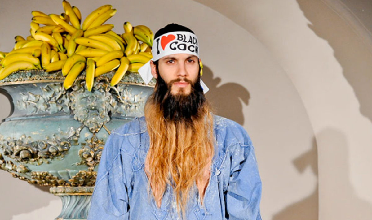 Oh dear. Fashion provocateur Bernard Willhelm rarely fails in titillating his fans and critics, even the trusty editors and buyers who maintain a seen-it-all attitude. This season's attempt to harry audiences at his fall 2012 showing came via headbands emblazoned with the phrase "I [heart] black cock" on them. I don't think it's too easy to ruffle my feathers, but this accessory stopped me in my tracks. What do you think of Willhelm's risque headgear?