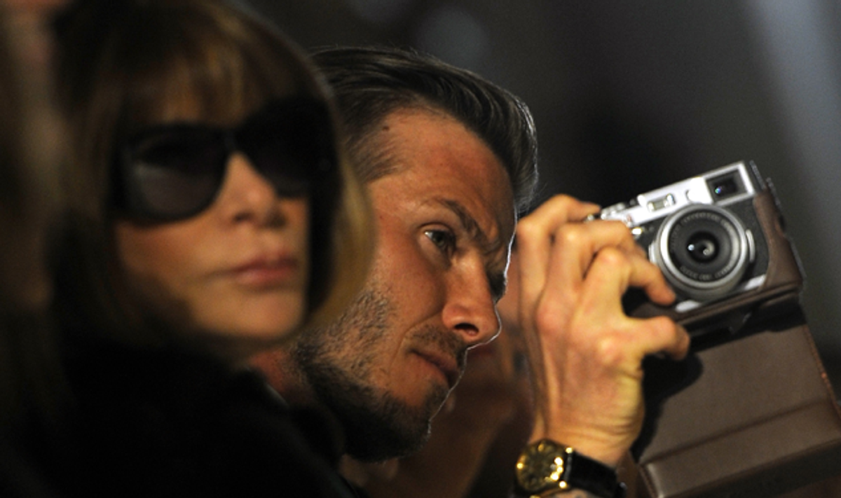 Fashion week is strange for many reasons, and nothing demonstrates this more clearly than the odd mash-up of run-ins that take place. Here, high-ranking editors mingle with bloggers who bump into film and TV stars, who chat with models and designers. It's a big melting pot of eccentricity. But if you're famous enough to get front row seating at a show, there's a likely chance that you'll be sidling up with none other than Ms. Anna Wintour, which is exactly what happened this morning when soccer star David Beckham crashed his wife's show--the first time he's attended one of her presentations. David, like an adoring fan, was snapping pictures of the clothing front row as Wintour looked on, sunglasses firmly in place, per usual.