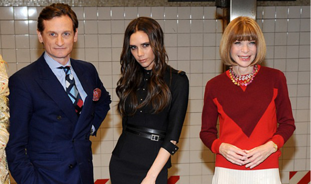 Imagine, if you will, that you're on the jam-packed subway during rush hour--annoyed but trying to manage your frustration--sipping your coffee and being jostled by strangers, when you glance over and find Vogue's Anna Wintour sitting, reading the morning paper (WWD, of course) next to Victoria Beckham. Tell us--what exactly would be going through your mind?