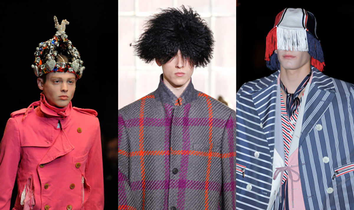 Traditionally, the Kentucky Derby--which takes place this today and tomorrow--is a time to leisurely place gentlemanly bets on horse races, sip tasty Mint Juleps, and display a dapper ensemble that calls to mind the classic, genteel Southern charms of yore. For ladies, it's also an excuse to wear a hulking, embellished, and ridiculous chapeau--but why should the girls have all the fun? A quick look at the spring 2012 runways shows that there was a plethora of outlandish acts of millinery begging to top of an otherwise pedestrian outfit. Here, we feature just a few of the options--from a regal jeweled crown to a gypsyfied baseball cap--available to men who'd like to prove that their own sartorial savvy can easily eclipse the glamour of a wide-brimmed socialite's topsy-turvy topper.