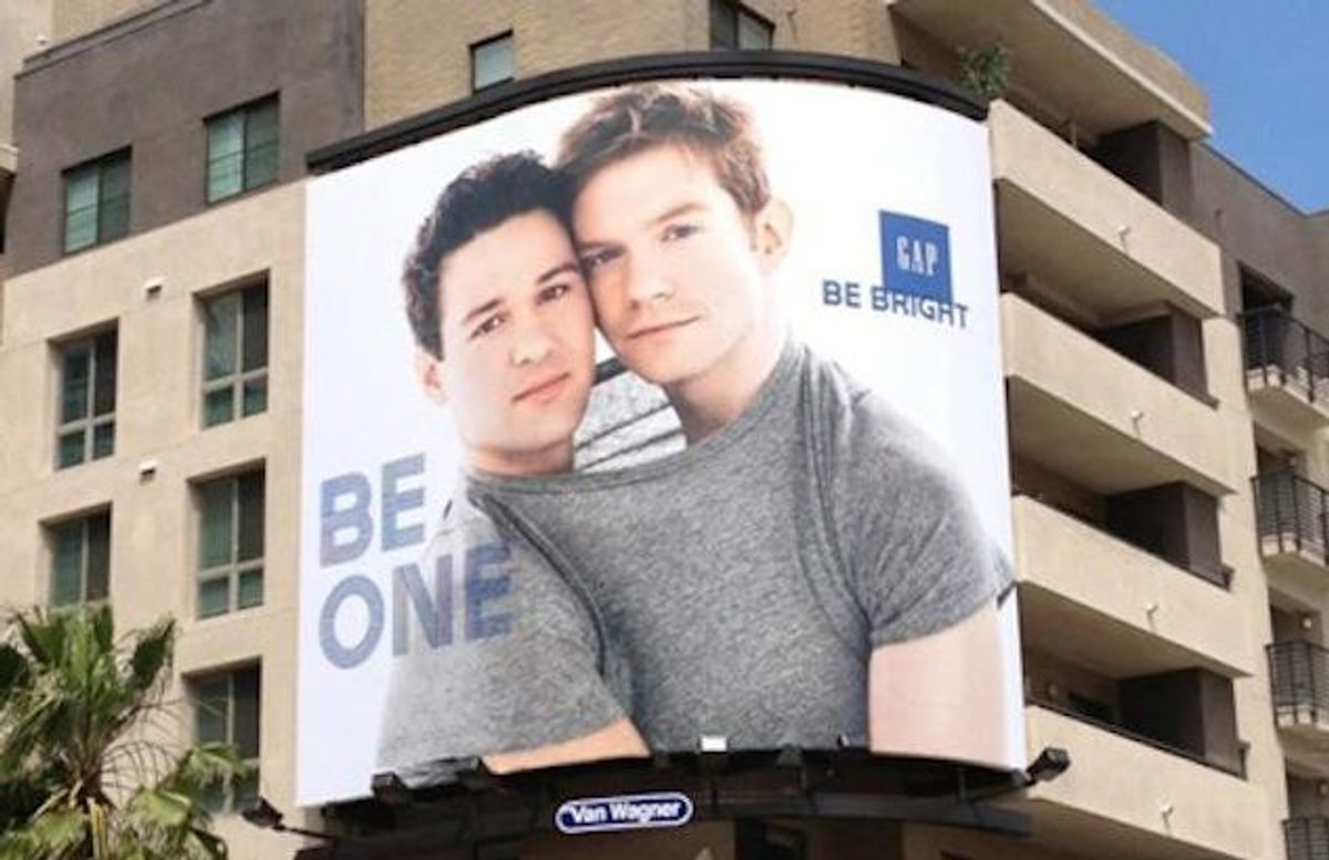 "In Los Angeles, CA, GAP has a billboard located downtown that reads: "GAP- BE BRIGHT- BE ONE" with two homosexual men pressed together under a shared t-shirt. They are hugging each other and facing the camera cheek-to-cheek. "BE ONE" is in large letters which emphasizes the same-sex relationship.