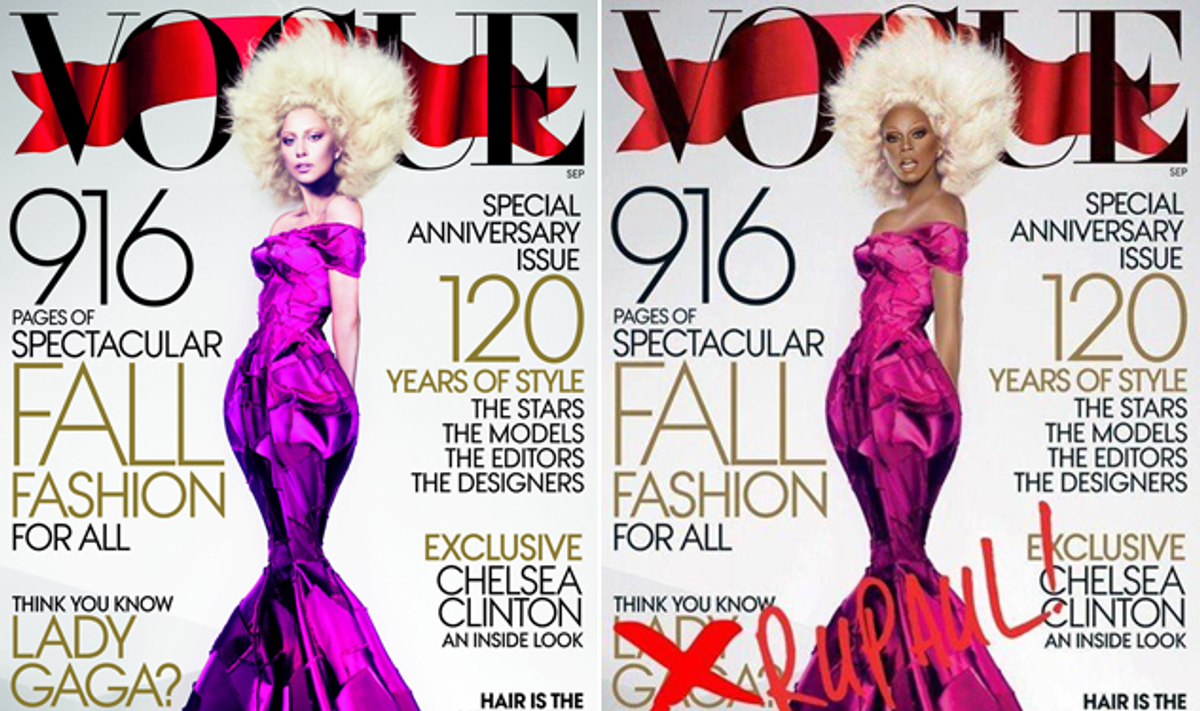 The folks at Fashion Week Daily saw Gaga's latest acheivment--gracing the cover of Vogue's September issue--and saw that there were some similarities to another infalous diva: RuPaul. They created their own mockup of what the hefty glossy would look like, had Wintour been a fan of Drag Race, and it's splendid. So...who wore it better? Should RuPaul stay, and Mother Monster sashay away? We leave the decision up to you, dear readers. Gaga, ever the good sport, has already given credit where credit is due, on Twitter.