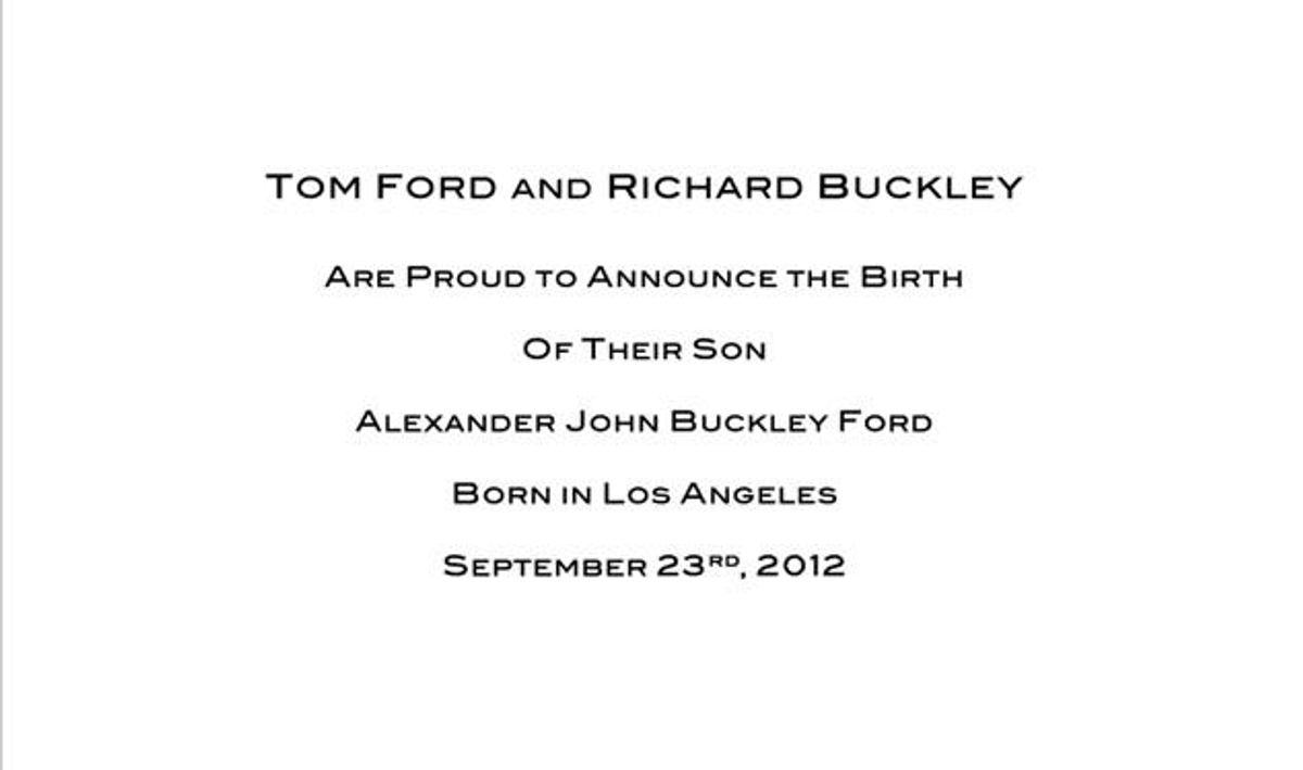 Fashion designer Tom Ford, 51, announced the arrival of his baby son Alexander with his longterm partner Richard Buckley, 64, today. We were informed that Alexander and John are both family names from Tom Ford's grandfather.