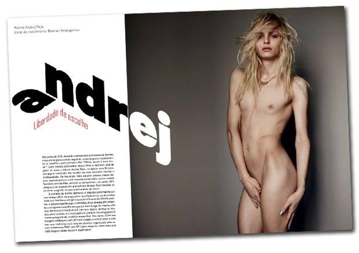 The headline translates as: "Freedom of Choice." Although it's being called his "most revealing shoot yet," this isn't the first time Pejic has stripped down for the camera.