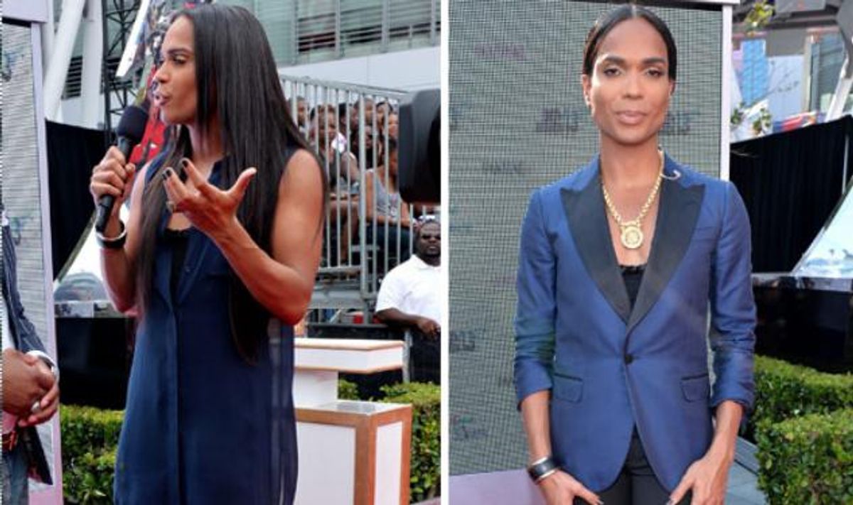 In case you didn't follow the saga, B. Scott was hired as a red carpet style correspondant at last month's BET Awards, but shortly after the beginning of the event, he was allegedly asked to change his outfit, which consisted of a flowy tunic and pants worn with high heels. He reappeared wearing a men's tuxedo with flat slippers, his hair pulled back into a pony tail and without lipstick -- a toned-down take on his usually very feminine image.