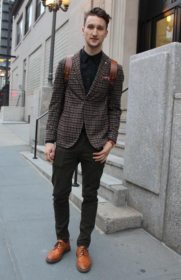 In this week's edition of OUT On The Street, we came across menswear blogger One Dapper Street (aka Marcel Floruss) at a Coach collection press preview. Dressed in his blog's namesake style, Marcel sports a perfect combination of autumn shades: olive, taupe, burgundy and cognac.