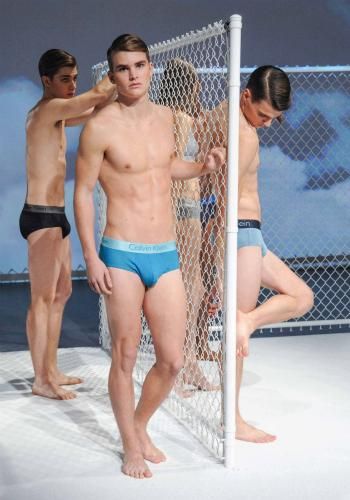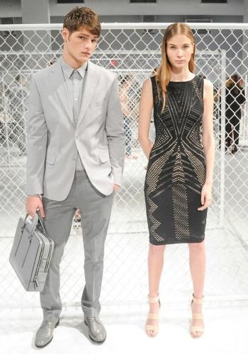 Calvin Klein presented its latest men's and women's White Label collections for Spring 2014. The models posed in vignettes formed by white chain link fences, set against a blue sky wall projection.