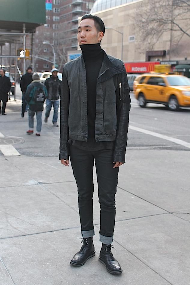 Fresh back from London, we hit the streets of New York again to continue our ongoing search for personal style. The edgy look of Jae Khan, a FIT student from Korea, struck a chord in our rocker sensibility. Khan wears a mixed-material jacket by Rick Owens paired with a sweater by Parisian designer Damir Doma, and leather boots by John Varvatos, of course.