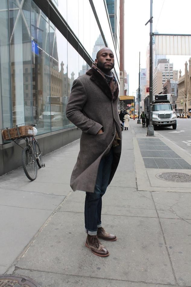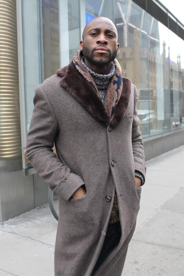 In this edition of OUT On The Street, wandering near Columbus Circle we spotted Michael, a jazz musician who rocks a faux fur collar overcoat found at a thrift shop. Michael pairs it with a marled gray turtleneck sweater and heritage Tommy Hilfiger boots, adding a touch of dandyism to his outfit with a paisley print scarf.