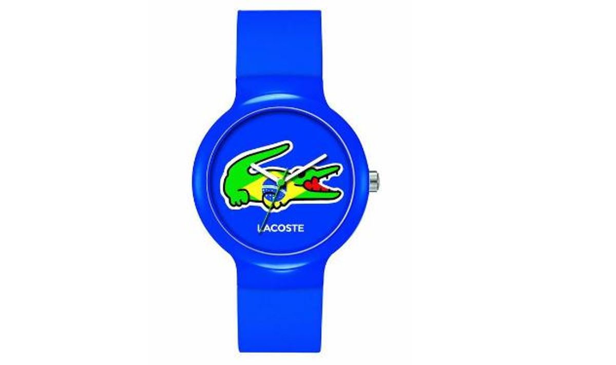 Let's start by setting our clocks to Rio de Janeiro time with Lacoste's fun range of patriotic watches. The water-resistant dial, supported by a silicone band, features the signature Lacoste croc adorned in the colors of the Brazilian flag.
