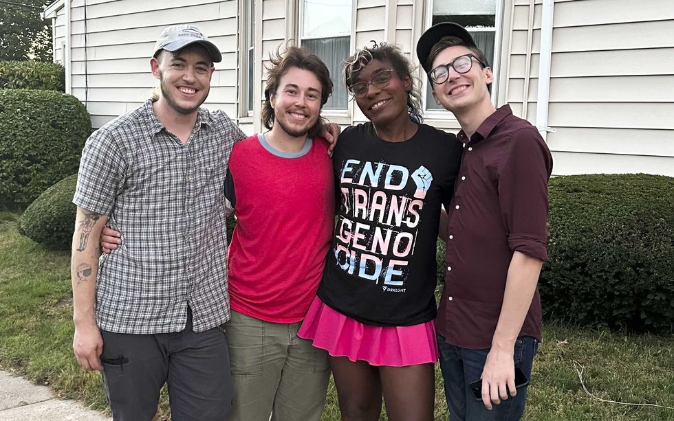 Four people from the Trans Heaven, Pennsylvania crew stand together. From L to R: Director of Photography Mad Bishop, Camera Operator & Gaffer Easton Carter Angle, Karleigh Webb, and Director Hansen Bursic.