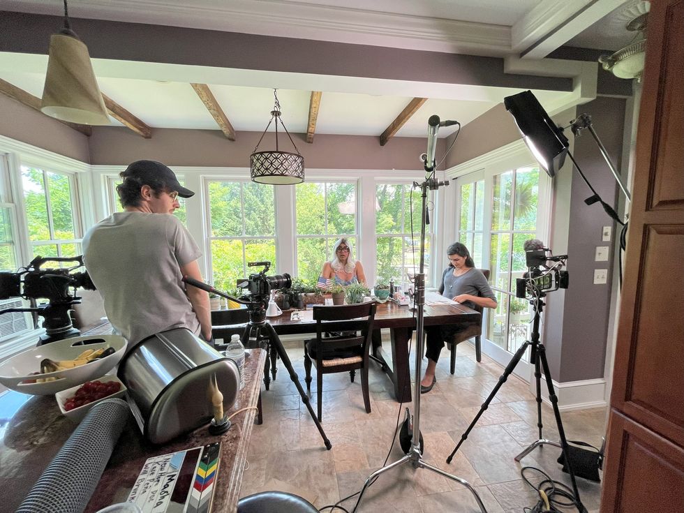 Interviewing producing director Alex Fraser (offscreen) of the Bucks County Playhouse with Director Joy Davenport (left), Director of Photography Adam Narwot (center), and Sound Op. Sonia Szczesna (right). (Photo by Mad Bishop)