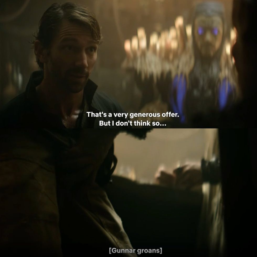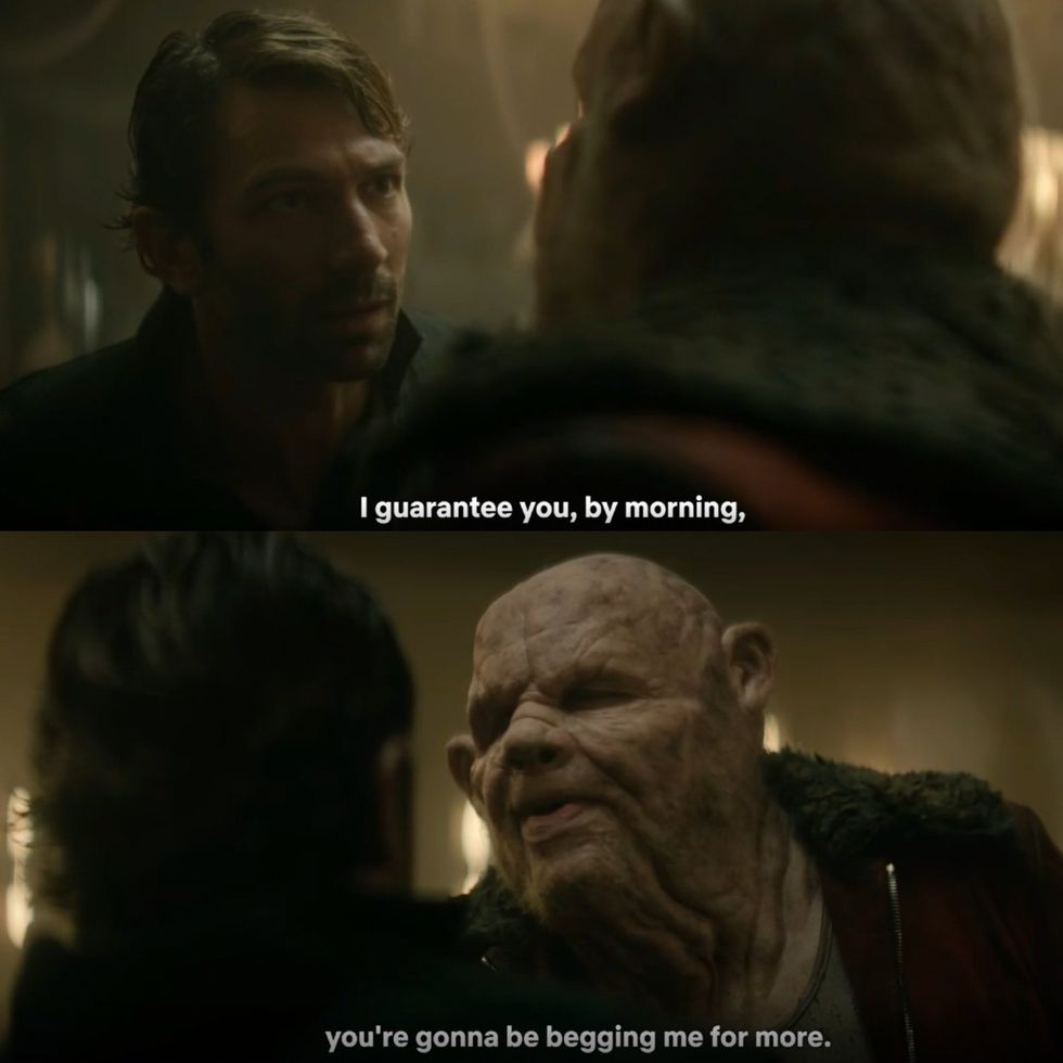 In one scene (around 49 minutes into the film), main characters Kora (Sofia Boutella) and Gunnar (Michiel Huisman) are in a bar very reminiscent of a Star Wars cantina. As they talk about their plan, a large, ugly, male alien approaches the two, licks his lips, and asks Gunnar, “Is this your owner? Everything’s for sale in this place, so, how much? You know, I have a room upstairs with relatively clean sheets.”