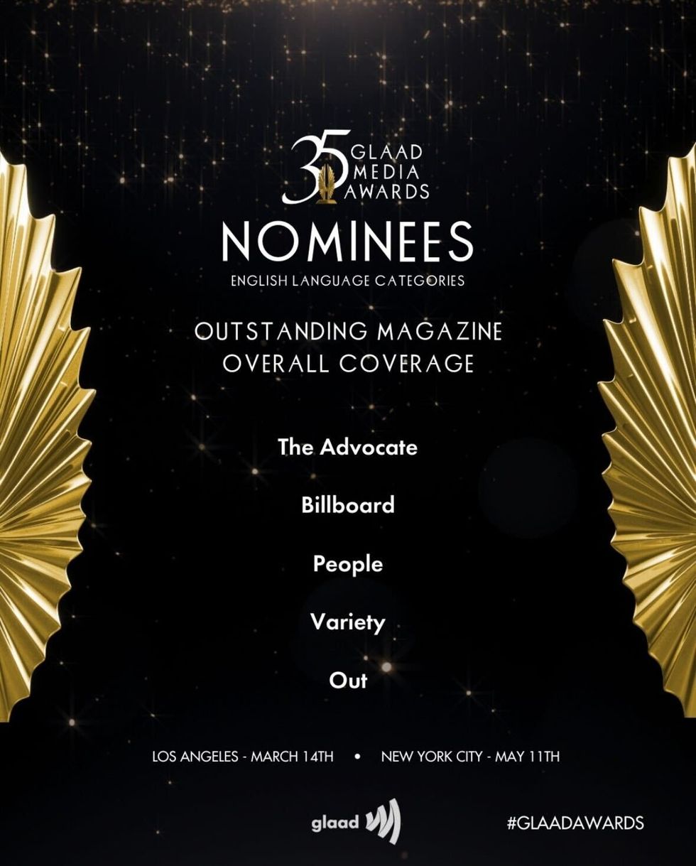 Check out all of the nominees here. The 35th GLAAD Media Awards will take place in Los Angeles on March 14 and in New York City on May 11.